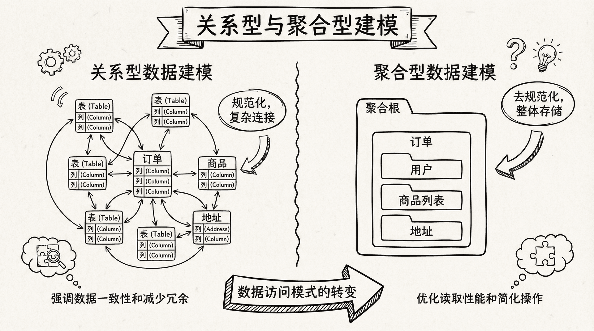 这两种建模方式各有优劣。关系型建模避免了数据重复,但查询复杂;聚合型建模查询简单,但可能存在数据冗余。