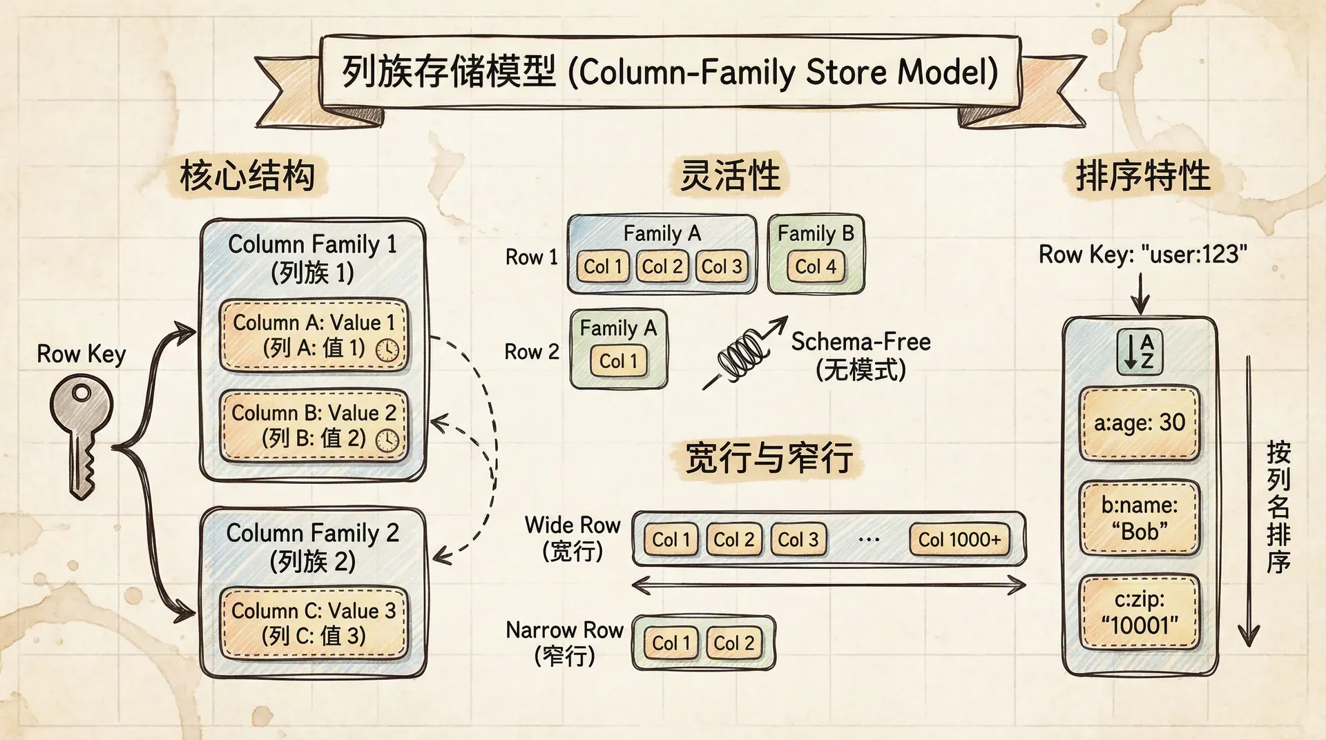 列族数据库属于聚合导向的数据库范畴,其数据模型兼具高扩展性与灵活性,在大规模分布式存储场景中尤为重要。该模型最早由 Google 的 BigTable 提出,随后被 Apache HBase、Apache Cassandra 等分布式数据库广泛采纳。 尽管名称涉及“列”一词,但列族数据库的列与传统关系型数据库的列本质上存在显著差异——前者强调的是列组对多维数据的高效组织和访问模式,并非平面表结构下的字段集合。