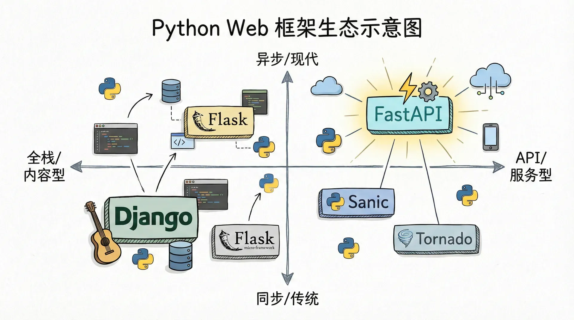 在今天的 Python Web 生态里,FastAPI 已经站稳了“现代 API 框架”的一席之地。它不取代 Django 在全栈内容站点和后台管理上的优势,也不取代 Flask 在极简原型和遗留项目中的灵活性,而是在“以 API 为主、强调类型与文档、需要异步 I/O”的赛道上成为默认选择之一。云原生、容器化和微服务化进一步放大了这类需求:很多团队希望用 Python 写服务层,同时要求服务能扛住一定并发、能自动暴露 OpenAPI、能与前端或移动端通过类型化契约协作,FastAPI 恰好满足这些诉求。理解它在生态中的这种“细分定位”,有助于我们在技术选型时做出理性判断,也有助于我们理解其未来演进会围绕“API 开发体验与性能”展开,而不是变成另一个 Django。