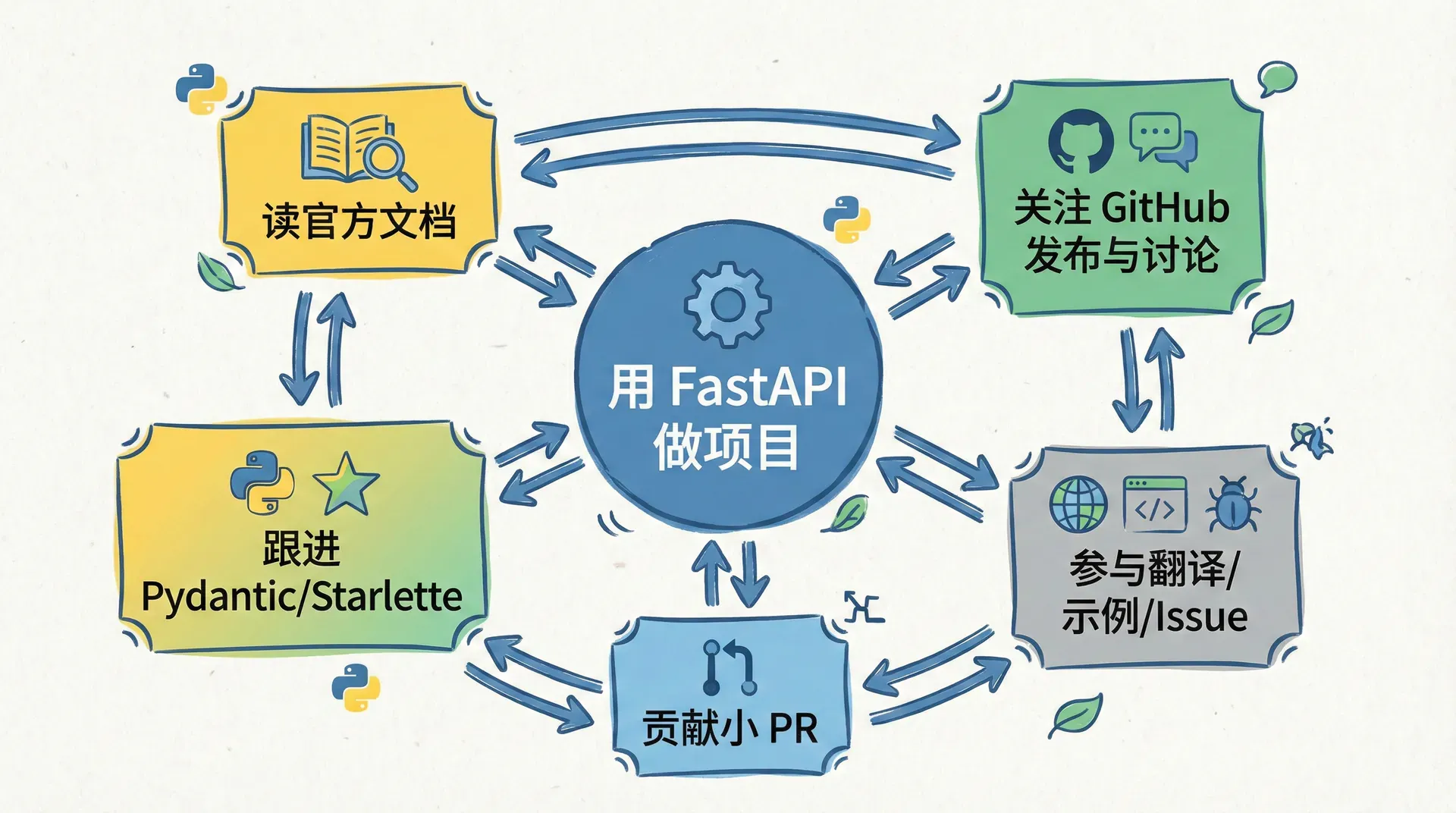 技术框架的“未来”不仅由维护者决定,也由使用者和贡献者共同塑造。持续学习 FastAPI 的最佳方式,是结合“用”和“跟”:在真实项目里用 FastAPI 解决问题,同时定期关注官方发布说明、GitHub 讨论和路线图。FastAPI 的文档和仓库都在 GitHub 上公开,新版本会注明新增与破坏性变更,遇到问题时可以先查文档和 Issues,再考虑提 Issue 或 PR。参与社区不一定非要写代码:翻译文档、整理示例、在技术博客或问答网站分享使用经验,都是在为生态做贡献,也能反向加深自己的理解。