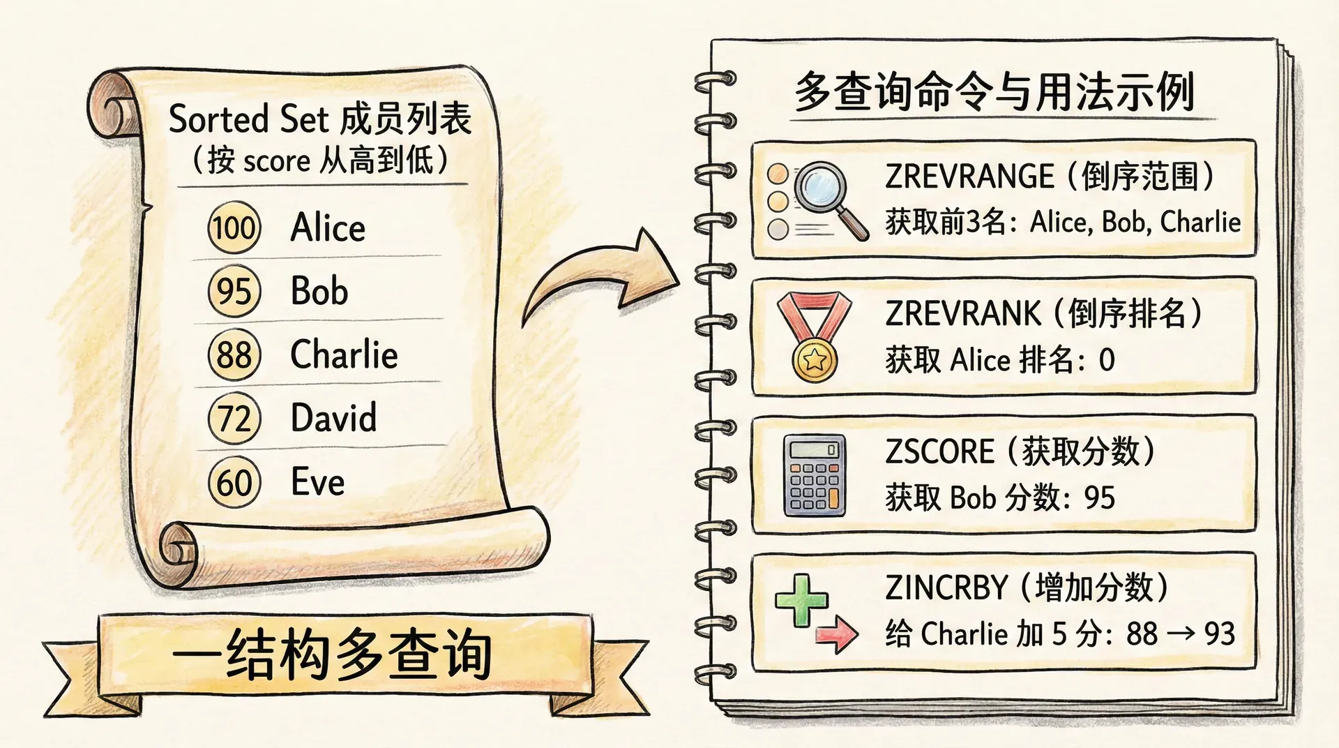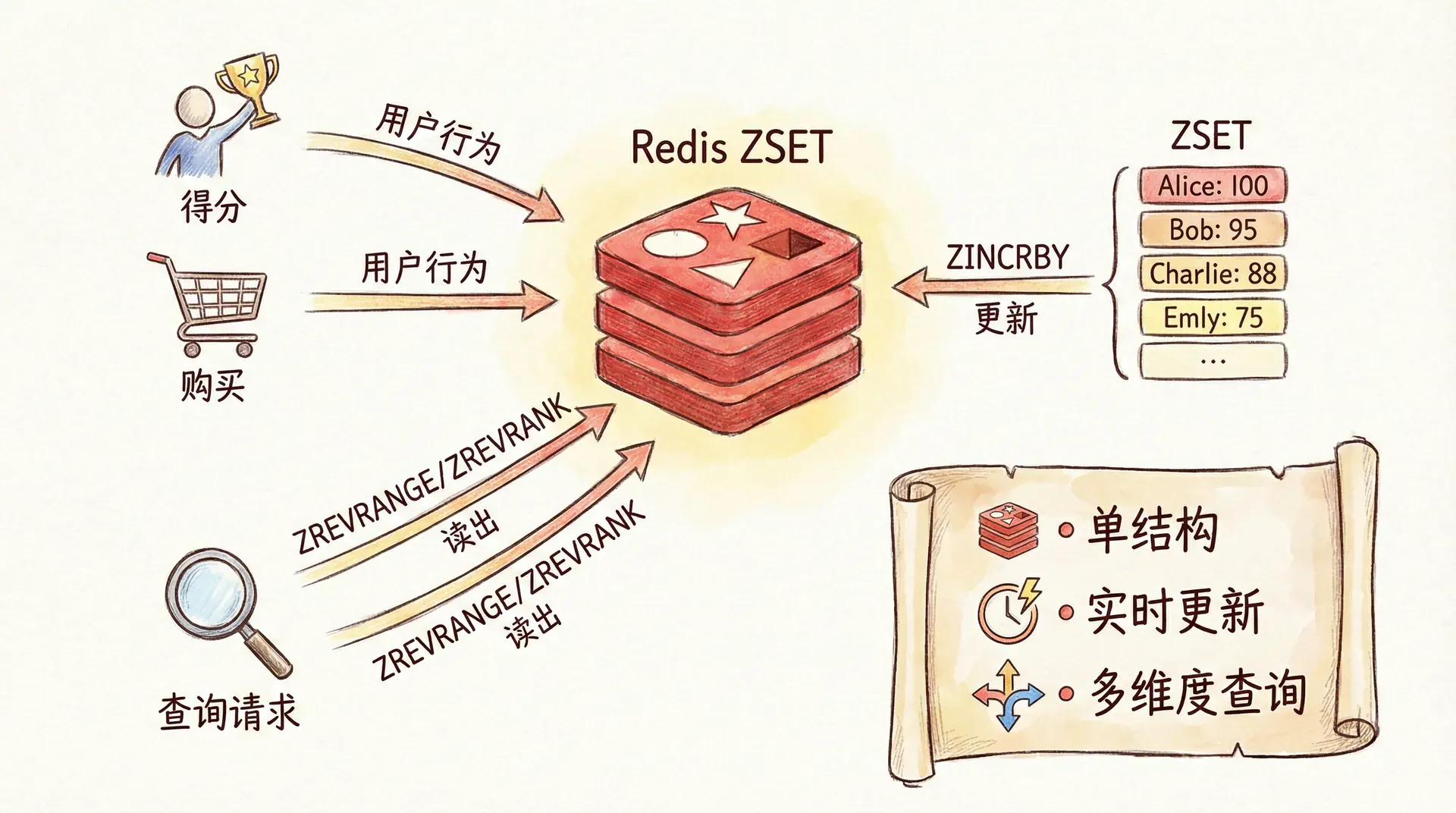 威力不仅在于快,还在于一次结构、多种查询。同一个 ZSET 可以按排名取 Top 10(ZREVRANGE 0 9)、按分数区间取「积分在 80~100 之间的所有人」(ZRANGEBYSCORE)、查某人排名(ZREVRANK)和分数(ZSCORE),无需为每种查询再建索引或冗余表。更新也简单:用户得分变化时 ZINCRBY 一次即可,排名随之更新,无需应用层重算或批量更新。因此,凡是「按一个数排序、需要实时更新、高并发读」的场景,Sorted Set 都是首选;排行榜只是其中最直观的一种,延时队列、滑动窗口限流(上一讲)同样依赖「按 score 有序、按区间删查」的能力。