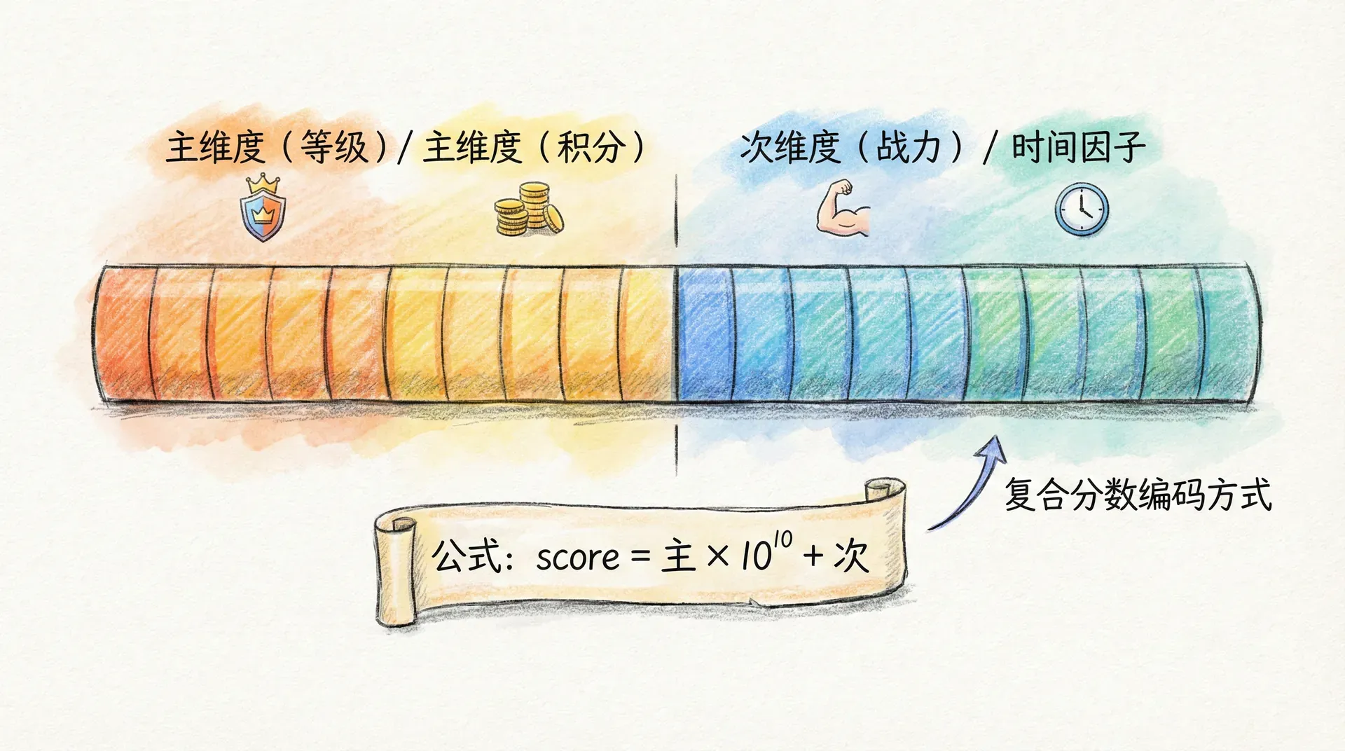 |复合 score 示例(等级主、战力次): score = level * 1e10 + power 同分时按时间(先达成略高): score = main_score * 1e10 + (1 - timestamp / 1e10)