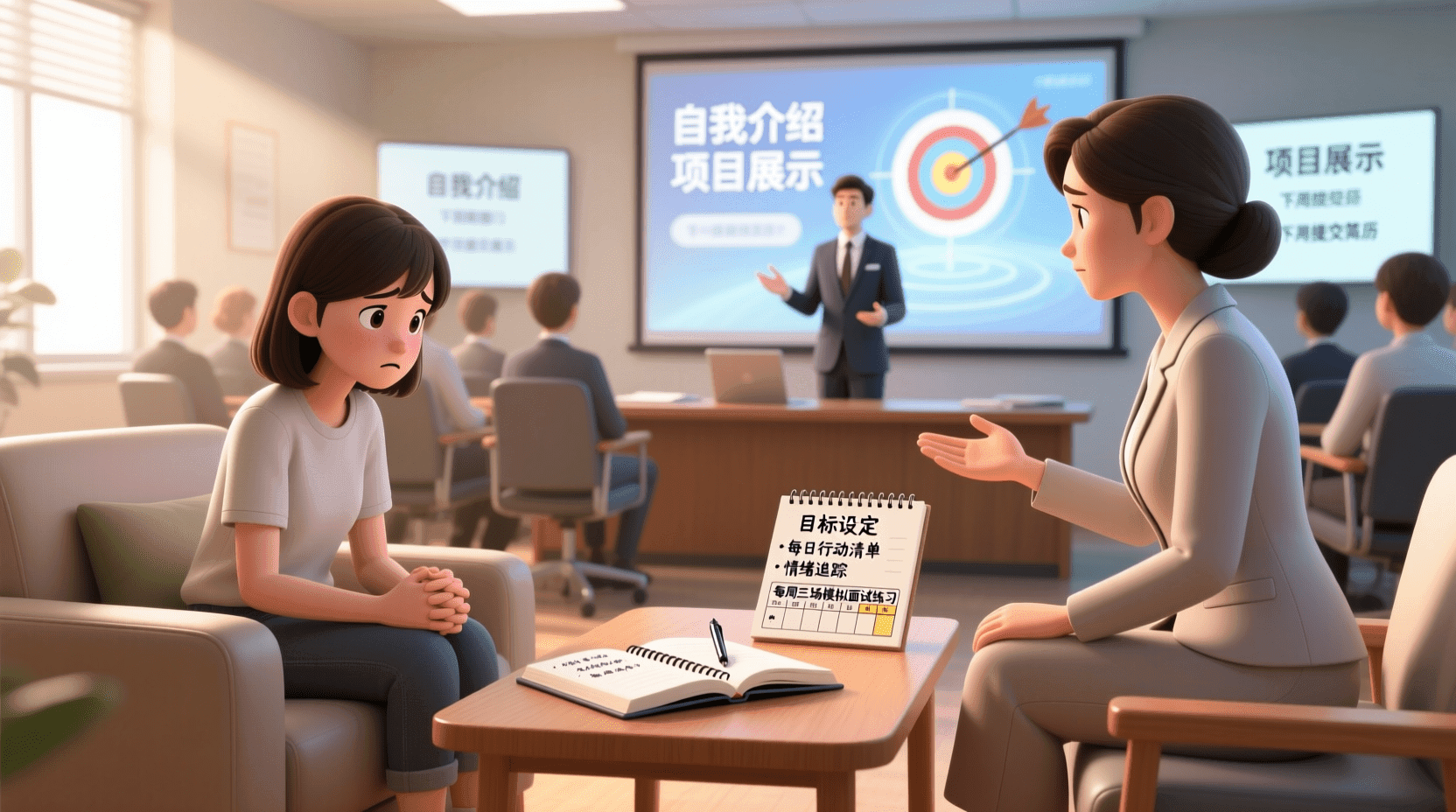 在某市的一个大学心理咨询中心,一名大三学生因为即将面临就业压力而寻求帮助。治疗师与她合作制定了具体的目标:在两个月内能够独立完成至少三次模拟面试,并在面试过程中将焦虑水平降低到可管理的程度。