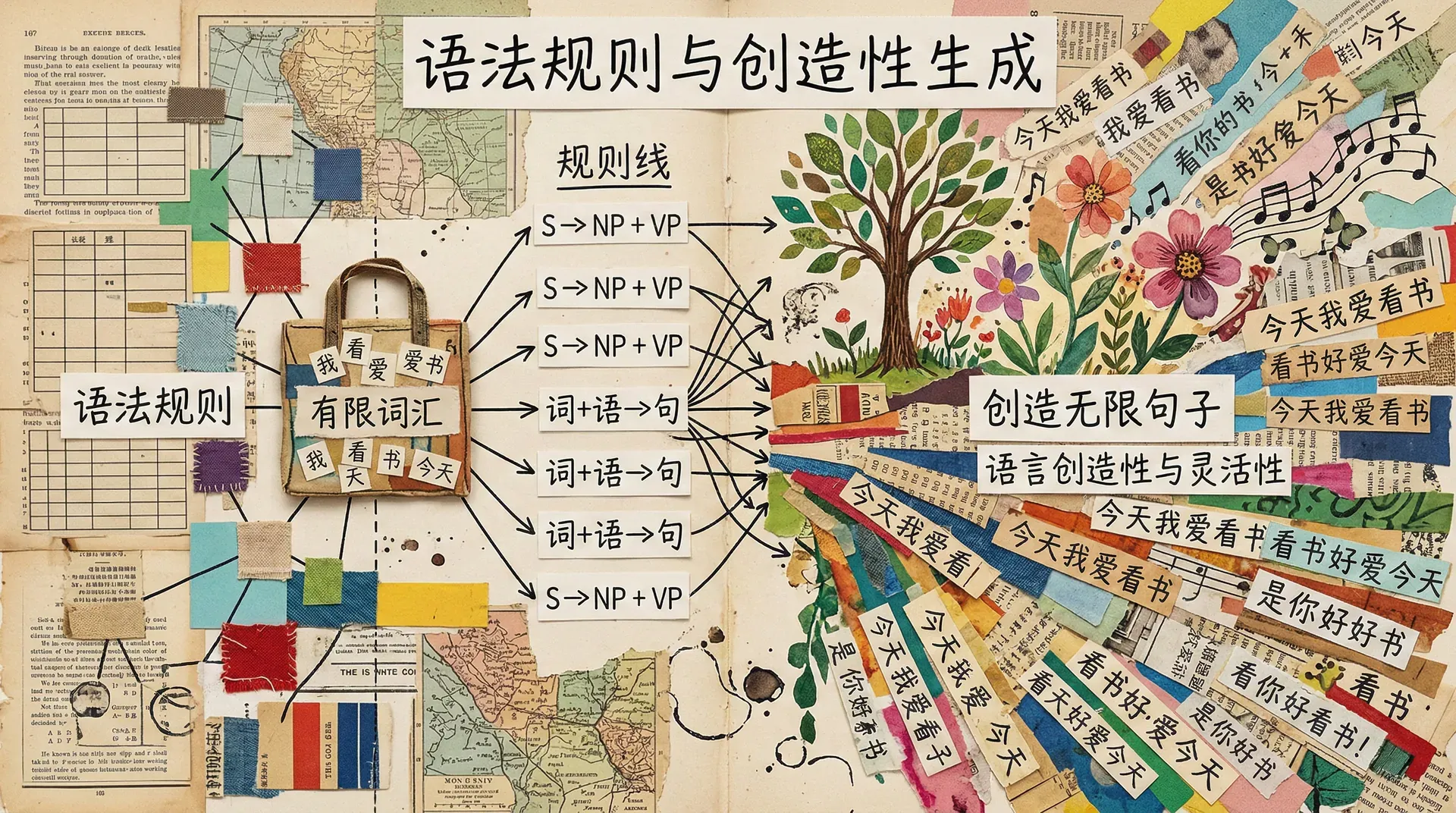 在理解语言的过程中,我们不仅要考虑词汇和结构本身,还需要关注这些元素是如何通过一系列规则被有序地组织和产生出来的。这些规则被统称为语法规则。语法不仅规范了我们可以如何组合词语,更赋予了人类表达无限多样思想的能力。正是这些规则,使我们能够用有限的词汇,生成和理解数量几乎无限的新句子,实现了语言的创造性和灵活性。