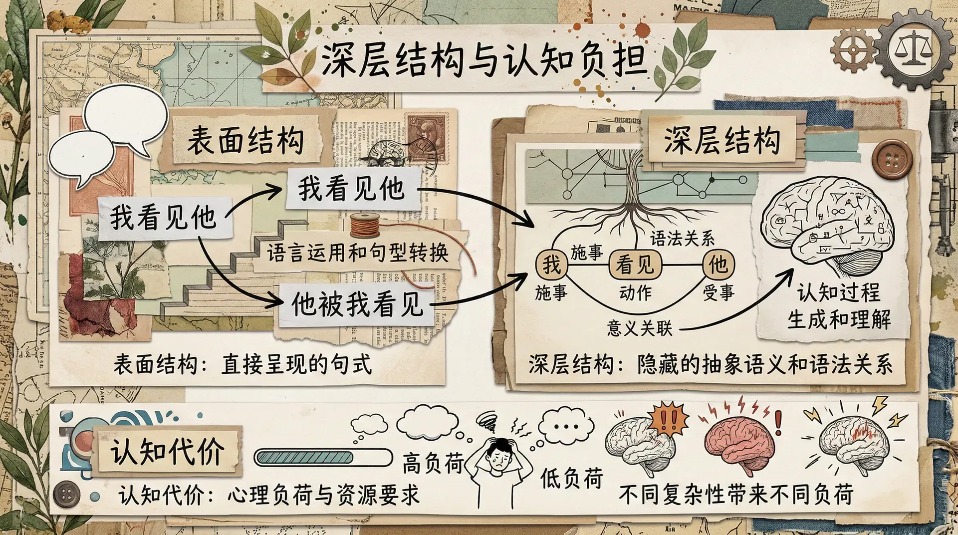 在理解语言的过程中,人类大脑不仅需要识别句子的表面结构,还要处理隐藏在句子背后的深层结构。深层结构描述的是句子最基本的意义关联和语法关系,是生成和理解丰富多变表达形式的基础。这种抽象的结构并不直接显现在语言表面,而是在语言的实际运用和不同句型转换中展现出来。理解和处理深层结构,对认知资源提出了更高的要求,不同层次的复杂性会带来不同程度的心理负担。