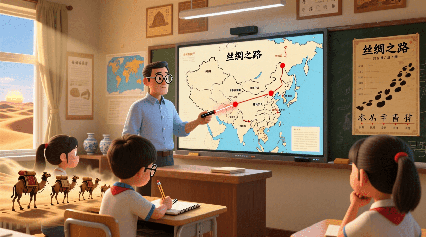张老师为六年级学生讲授中国古代丝绸之路历史,课程主题是“古代商队的艰难旅程”。她在大屏幕上展示古代中国地图,用激光笔标出路线:“古代商人从长安出发,沿丝绸之路西行,经过河西走廊,穿越沙漠,到达中亚及更远地区。一个典型商队约有50到100头骆驼,每头骆驼可载重150公斤。”