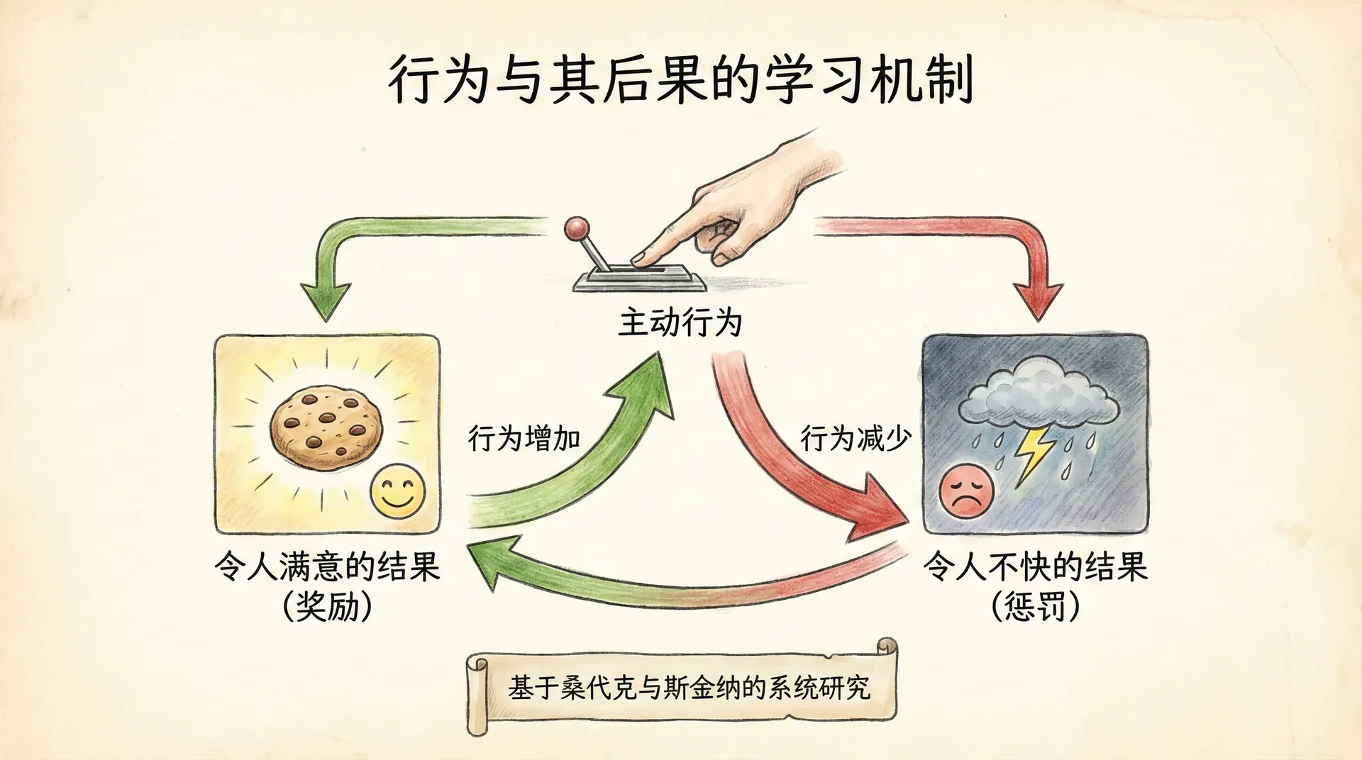 经典条件反射揭示了刺激与刺激之间的联结,而操作性条件反射关注的是另一种更主动的学习形式——行为与其后果之间的联系。简单来说,当一种行为带来令人满意的结果时,这种行为往往会增加;当一种行为带来令人不快的结果时,这种行为往往会减少。这个朴素的道理,经过爱德华·桑代克和 B·F·斯金纳的系统研究,逐渐发展成为一套完整的学习理论。