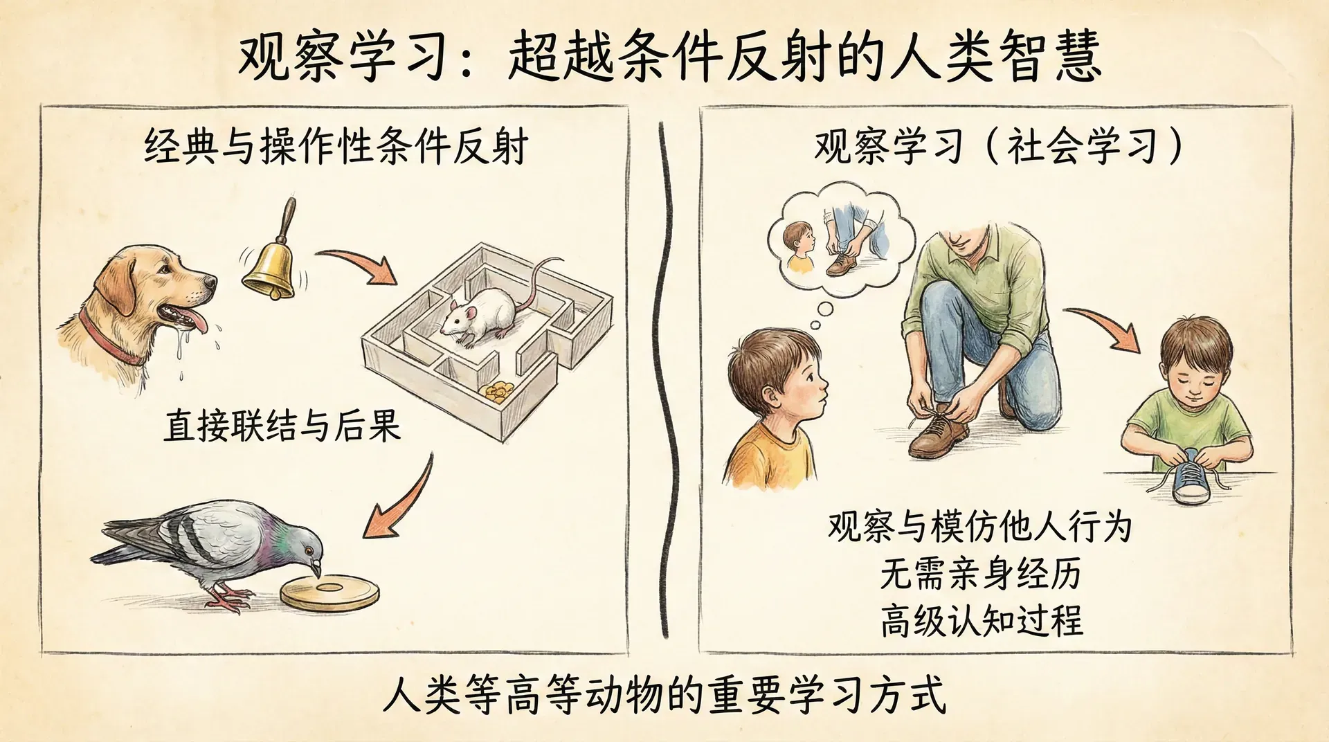 观察学习的根源并非人类独有。老鼠、鸽子、乌鸦和大猩猩都会观察他人的行为并从中学习,这说明观察学习是高等动物普遍具备的一种适应性能力。