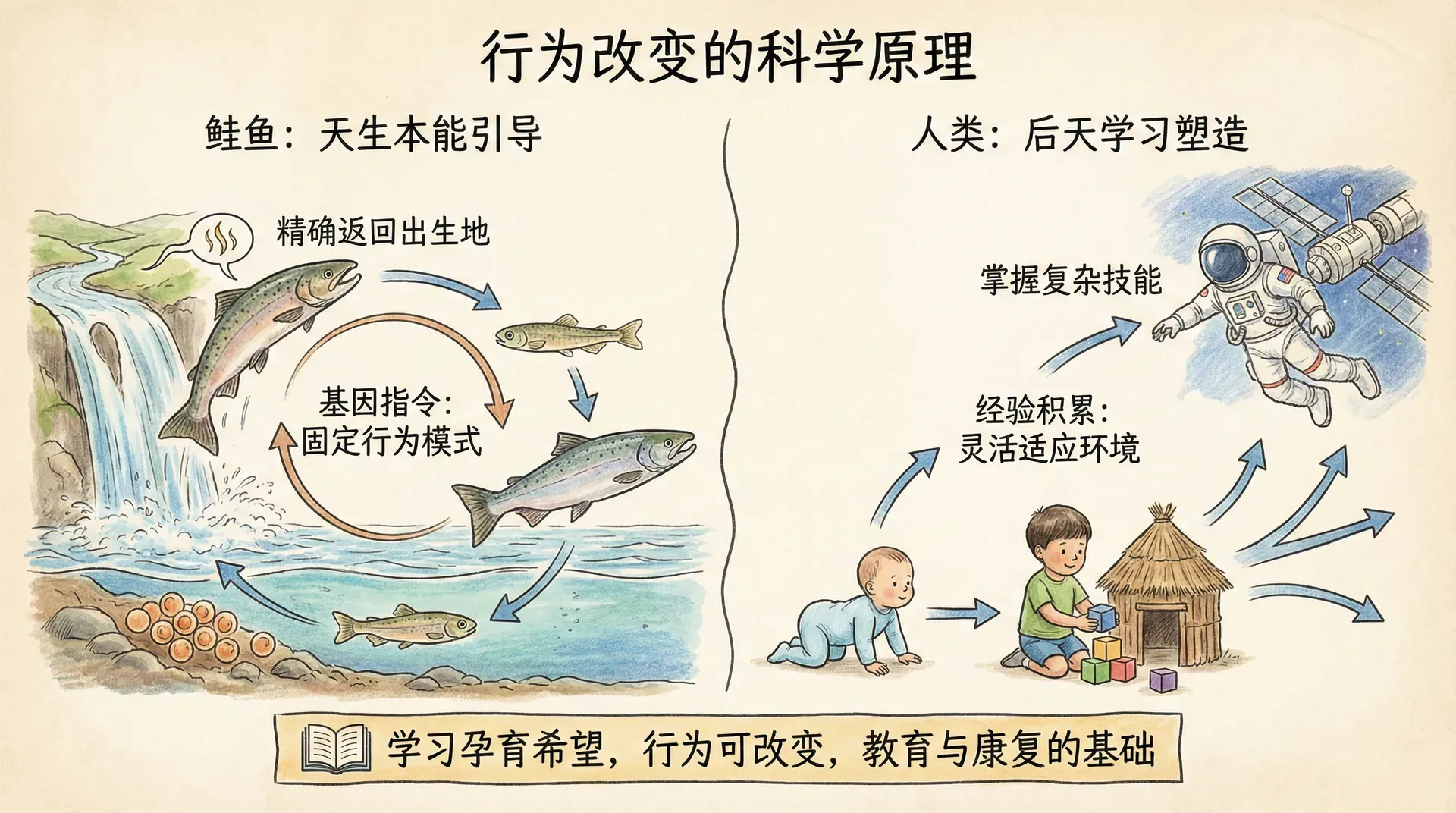 人类与鲑鱼截然不同。我们并非生来就有一套完整的生活蓝图,大部分技能都需要通过后天经验慢慢积累。虽然少了鲑鱼那种与生俱来的方向感,但学习赋予了我们更大的灵活性——我们可以学会建造草屋,也可以掌握建造潜艇和空间站的技术,从而适应几乎任何环境。
