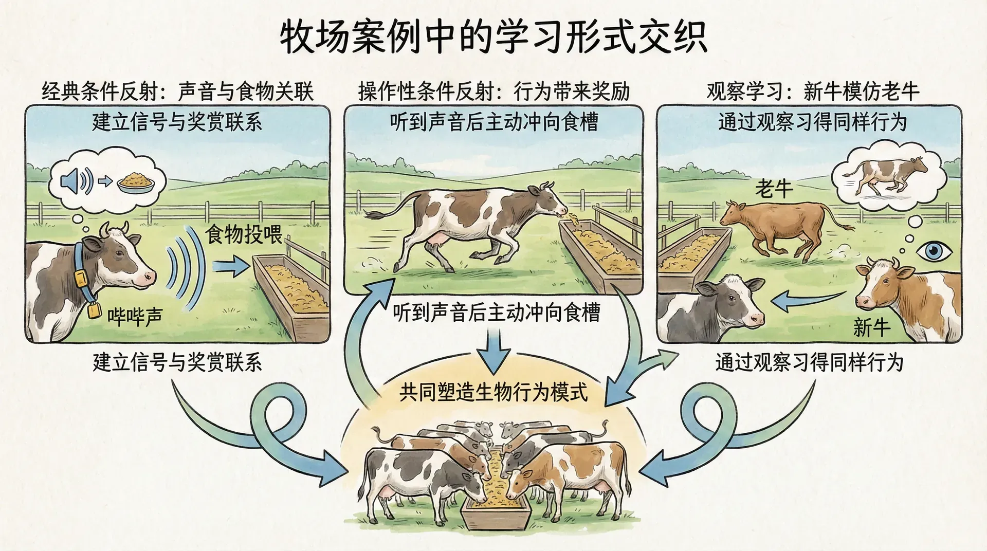 在现实生活中,这三种学习形式往往不是单独发挥作用的,而是同时交织在一起。日本某些牧场主给牛群配备电子定位装置,当哔哔声响起时提供饲料投喂,牛群既学会了把哔哔声与食物联系起来,又学会了听到声音后主动冲向食槽,而新加入群体的牛还会通过观察老牛的反应来习得同样的行为。这一案例说明,经典条件反射、操作性条件反射和观察学习在实际情境中常常同时发生,共同塑造着生物的行为模式。