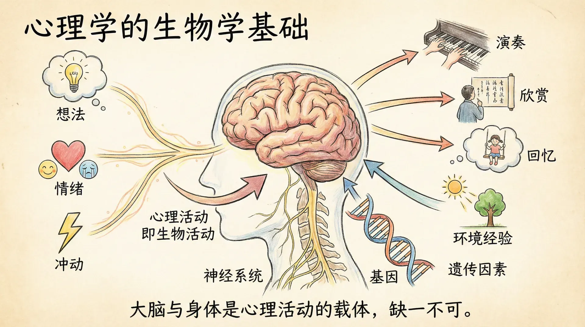 本节揭示了心理活动的生物学基础——从神经元传导到大脑功能分工,从信息传递到化学调节。要真正理解人类心理活动,必须综合考虑基因、大脑结构、神经传递和环境因素的复杂相互作用,这为理解正常心理功能和治疗心理障碍提供了科学基础。