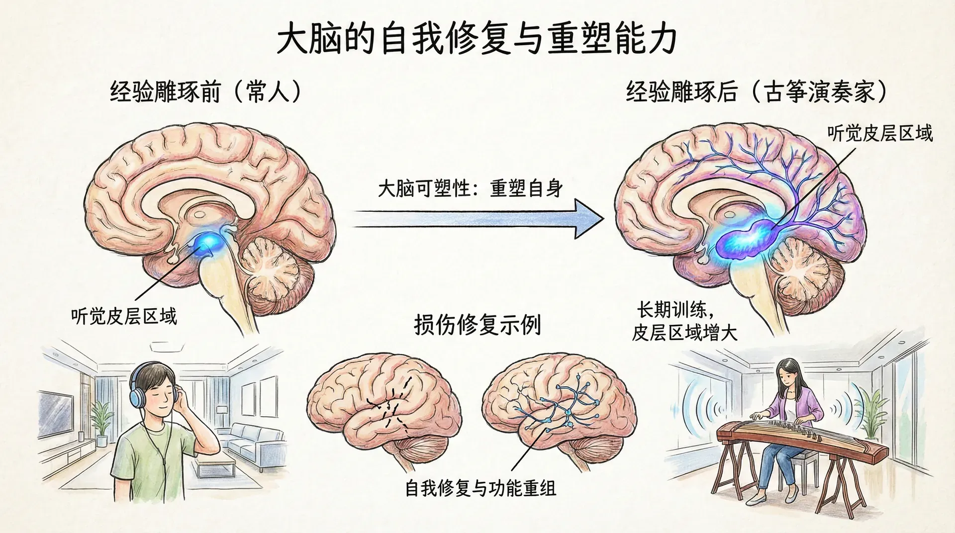 人类大脑是一个非凡的适应性系统,不仅受到基因程序的影响,更在经验的雕琢下不断重塑自身。通过现代脑成像技术的观察,我们发现经过长期训练的古筝演奏家,其大脑中负责处理琴弦音响的听觉皮层区域明显大于常人。这种现象揭示了大脑的一个重要特性——可塑性,即大脑在受到损伤后进行自我修复和功能重组的能力。