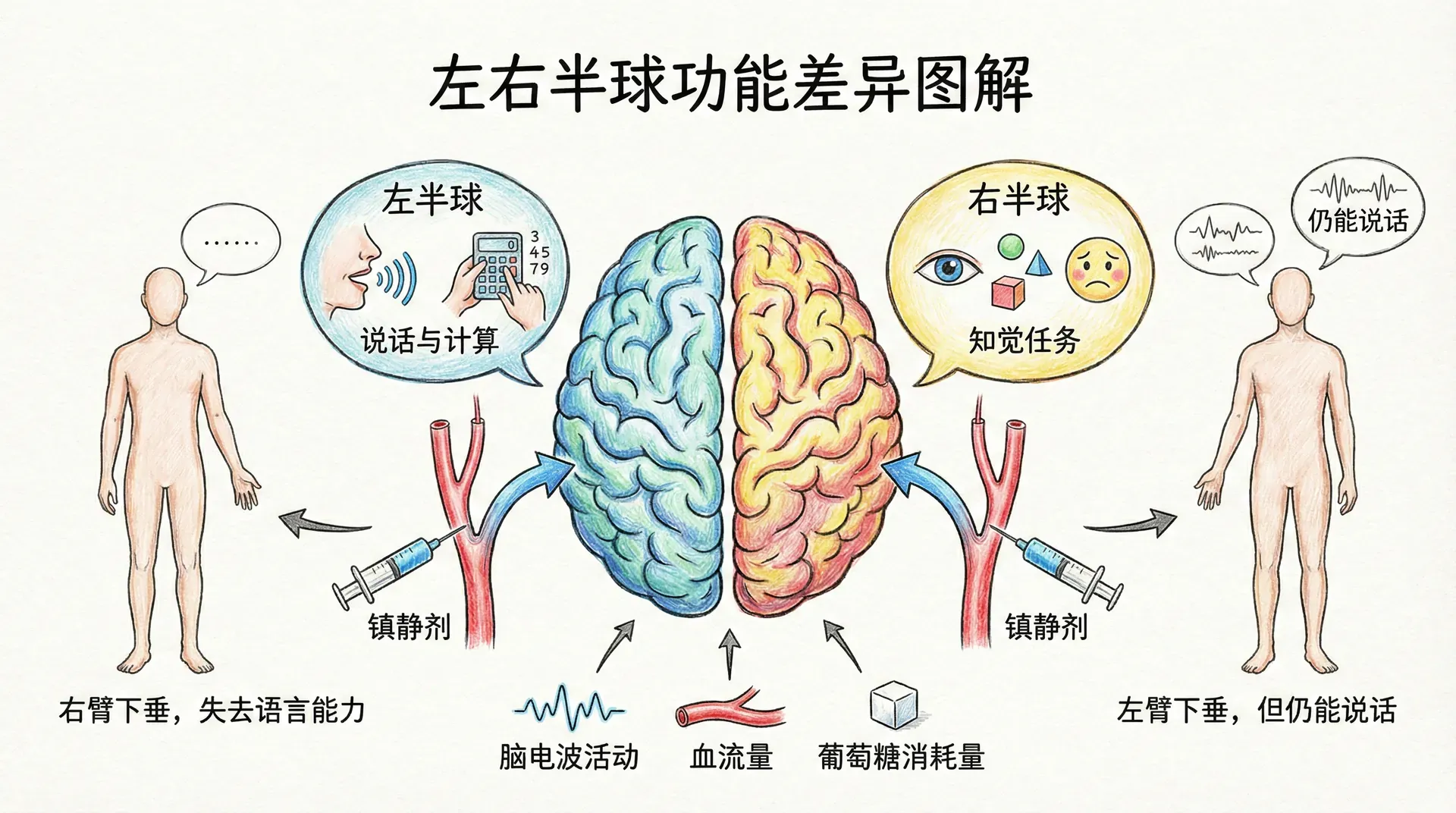 最戏剧性的证据来自脑外科手术前的检查。为确定语言中枢位置,外科医生向供应左半球血液的颈动脉注射镇静剂。当药物流入左半球动脉时,患者右臂软弱下垂并失去语言能力;当药物进入右半球动脉时,左臂下垂但仍能说话。
