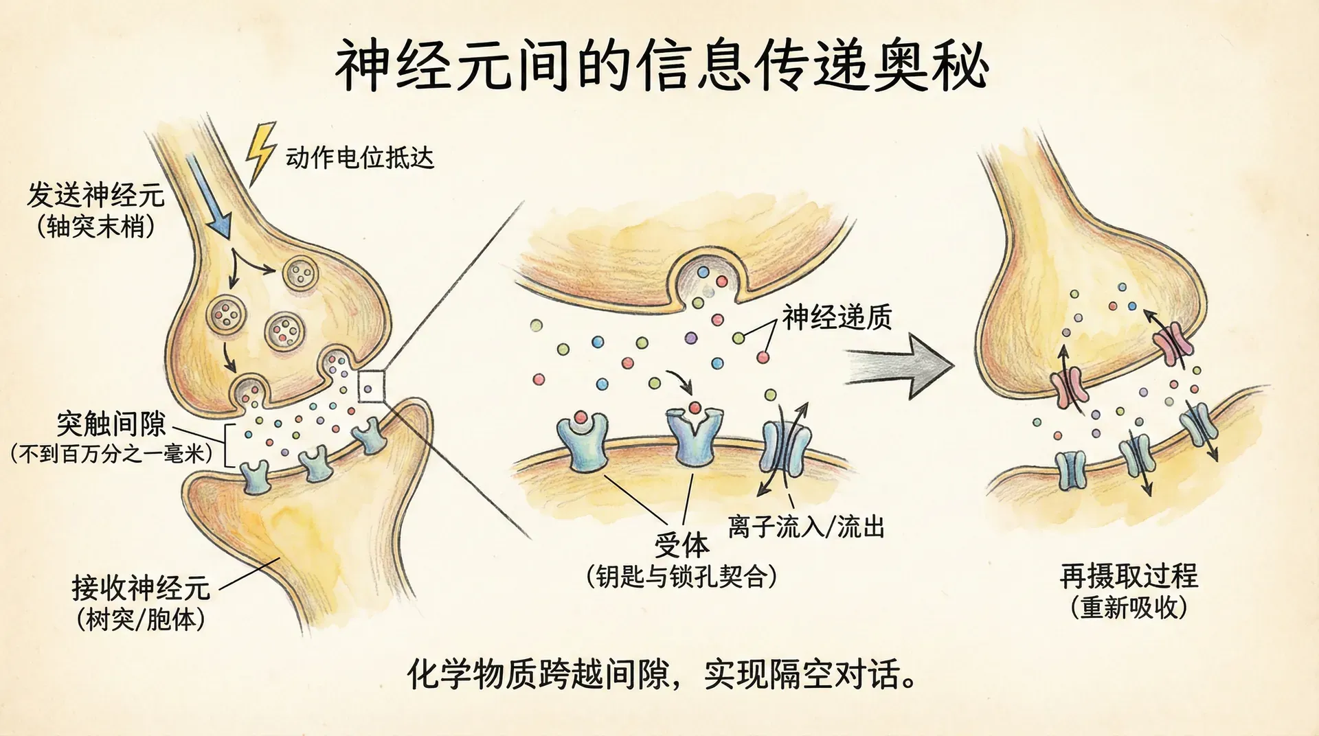 现代科学研究证实,神经元轴突末梢与接收神经元之间确实存在一个极其微小的间隙,这个被称为突触间隙的空间宽度还不到百万分之一毫米。西班牙解剖学家卡哈尔对这种神经元之间的“近距离接触”感到惊叹,他诗意地将其比作“原生质之吻”。这种精妙的结构设计就像两个人保持着刚好不接触的距离进行对话一样,既保持了独立性,又实现了有效沟通。那么,神经元究竟如何实现这种“隔空对话”,在微小的突触间隙中传递信息呢?这个问题的答案堪称现代神经科学最重要的发现之一。