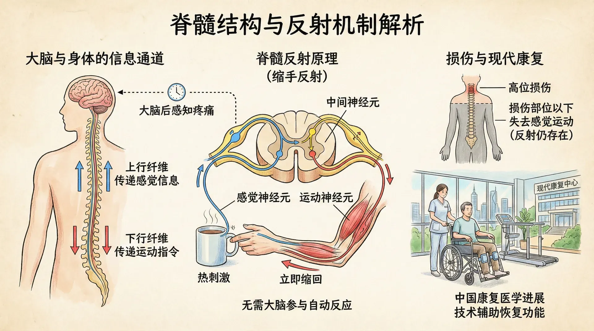 最简单的脊髓反射由感觉神经元、中间神经元和运动神经元构成。当手指触碰热水时,热刺激通过感觉神经元传至脊髓中间神经元,立即激活运动神经元,手在大脑感知疼痛前就已缩回。这解释了为什么反射动作似乎是自发的。