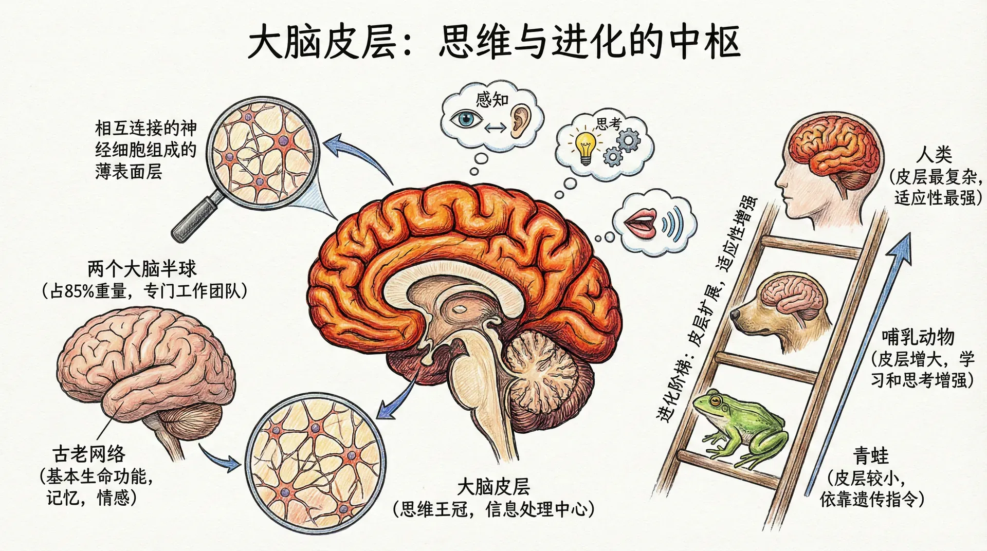随着我们在动物进化阶梯上的上升,大脑皮层不断扩展,严格的遗传控制逐渐放松,生物体的适应性随之增强。青蛙和其他皮层较小的两栖动物主要依靠预先设定的遗传指令运作。哺乳动物更大的皮层提供了增强的学习和思考能力,使它们能够更好地适应环境。使我们与众不同的人类特质主要源于大脑皮层的复杂功能。