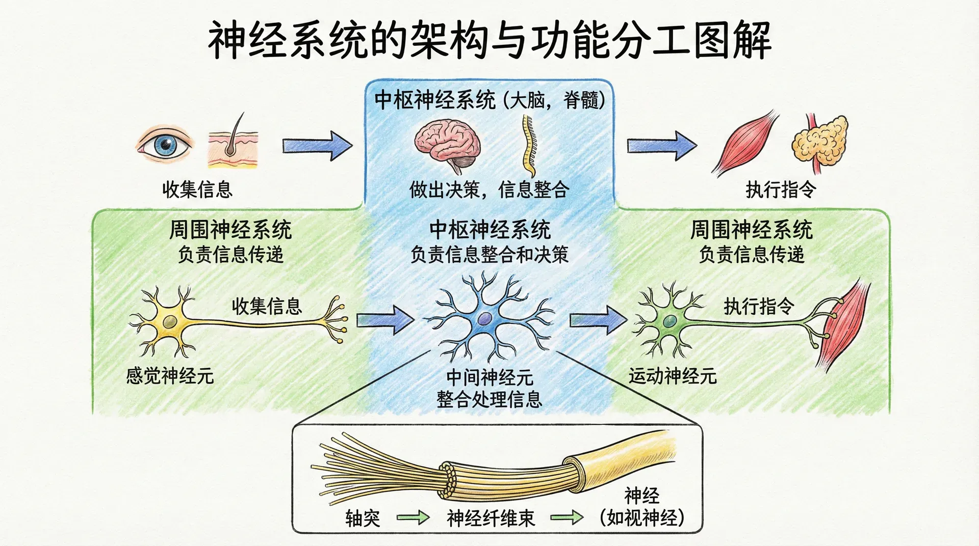 生命活动的核心是信息处理:收集信息、做出决策、执行指令。这一切都依赖于神经系统这个高效的电化学信息网络。神经系统分为两部分:中枢神经系统(大脑和脊髓)负责信息整合和决策,周围神经系统负责信息传递。