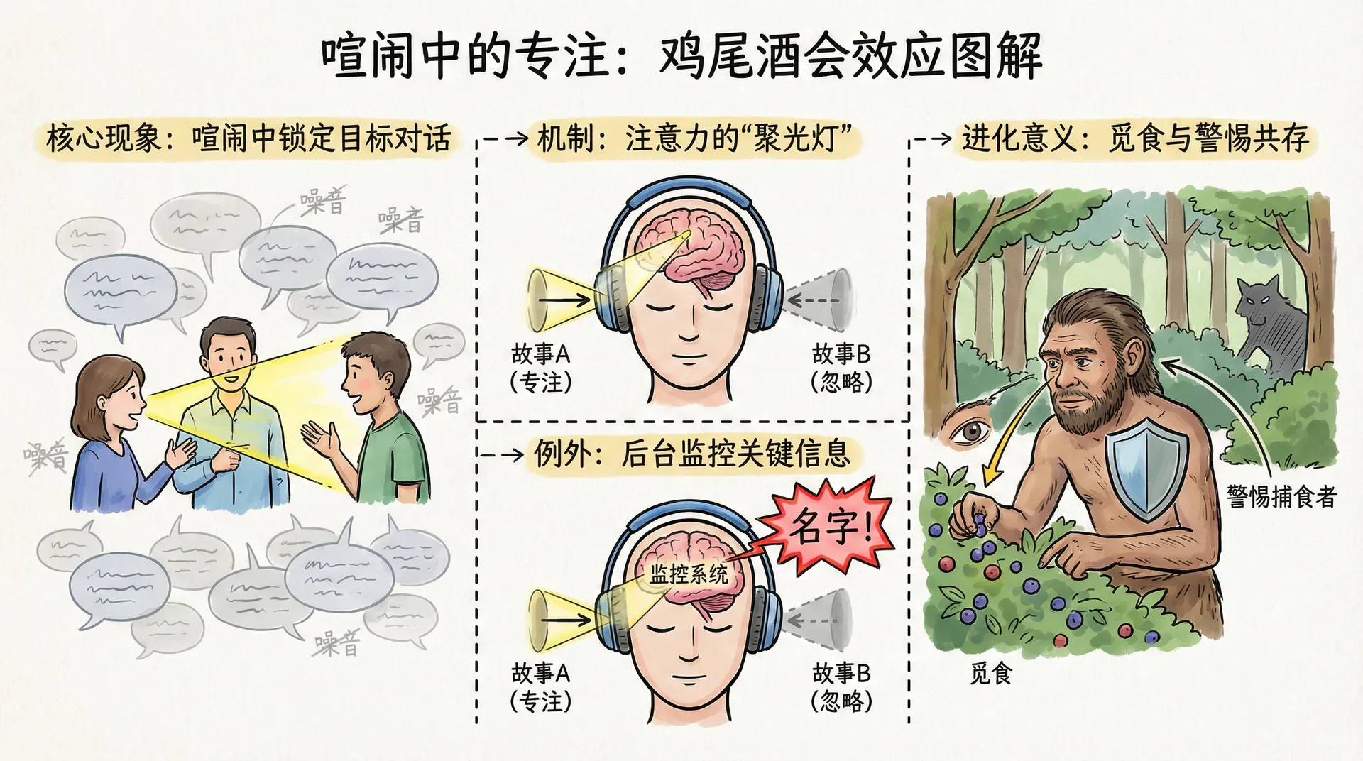 但有趣的是,即使你在专心听朋友说话,如果有人在嘈杂的环境中喊你的名字,你会立刻听到并转过头去。这说明我们的大脑有一个“监控系统”在后台运行,它会自动筛选重要信息,比如自己的名字、“着火了”、“小心”等关键词汇。