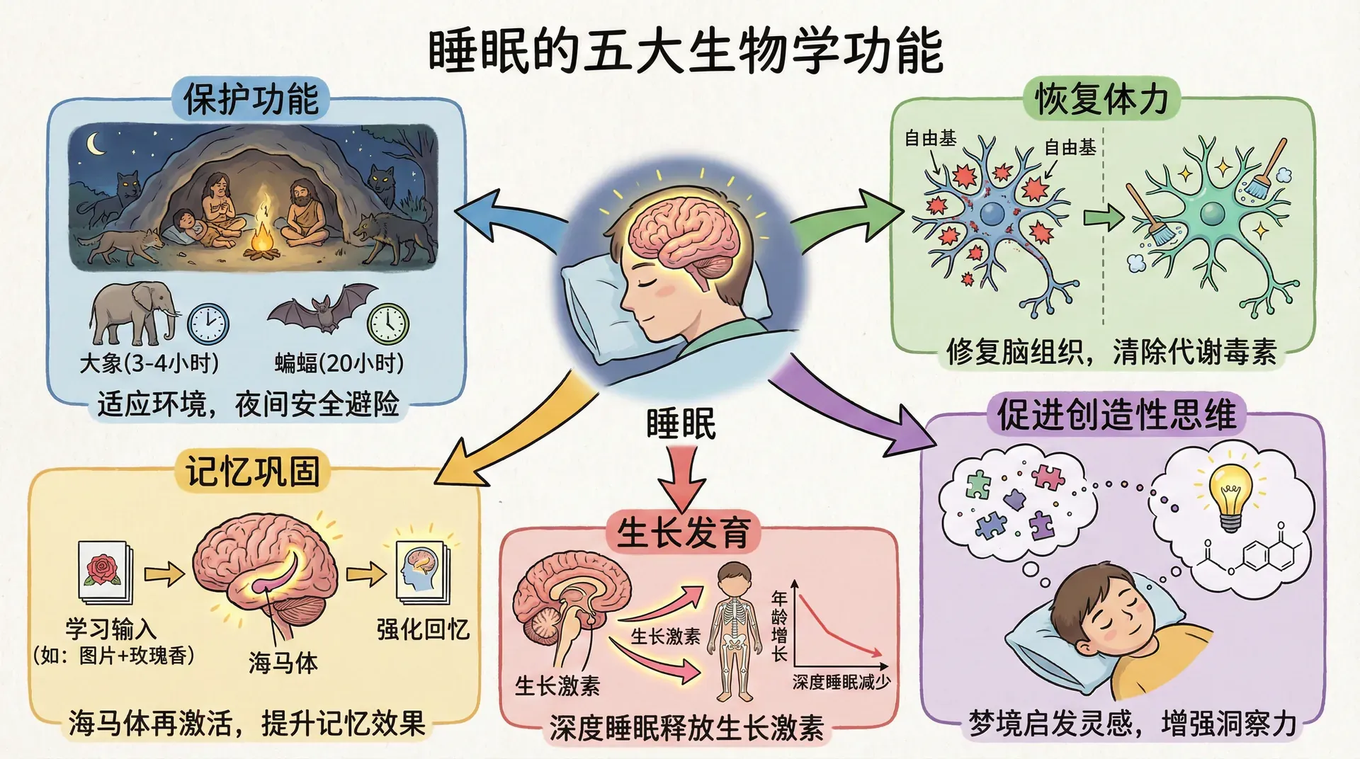 睡眠是大脑和身体的“维护模式”。在不同睡眠阶段,大脑承担着不同任务:深睡时清除代谢废物、修复神经细胞;REM期整理记忆和情感,产生梦境。睡眠直接影响记忆和学习。