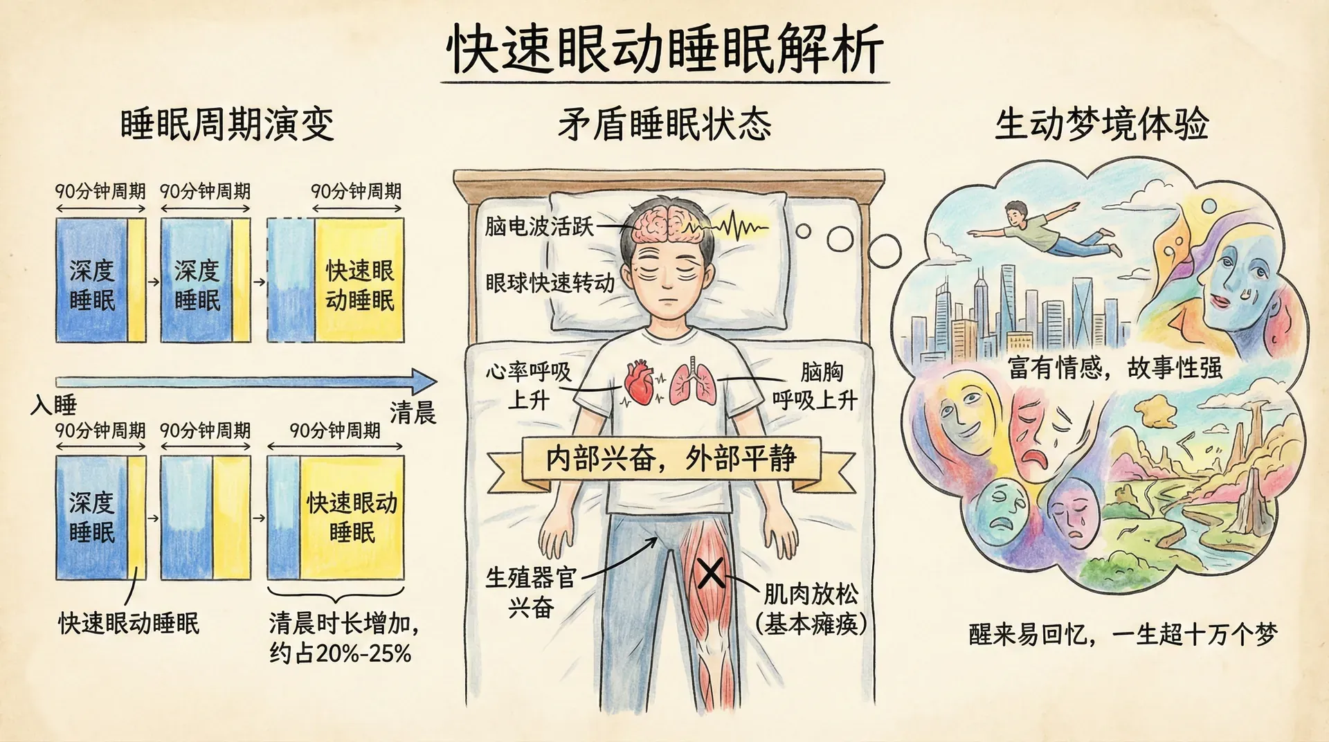 睡眠周期每90分钟重复一次。随着夜晚推进,深度睡眠逐渐缩短,快速眼动睡眠时间变长。到清晨,我们平均20%至25%的睡眠时间是快速眼动睡眠。虽然很多人很少记得梦境,但实际上每年体验约1500个梦境,一生中超过10万个。