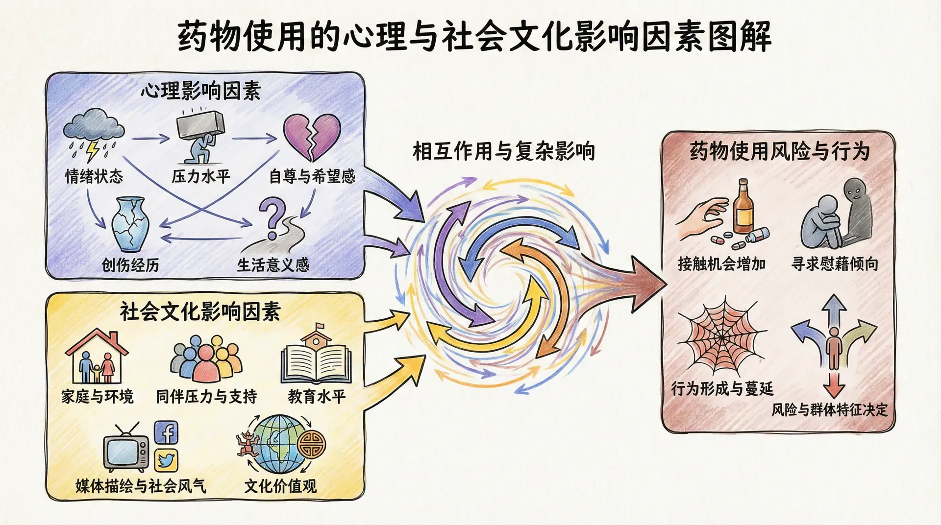心理和社会文化因素对药物使用有着深远而复杂的影响。一个人的生活环境、家庭背景、社会支持系统、教育水平以及所处的文化价值观等,都可能显著影响其接触和使用药物的机会与倾向。