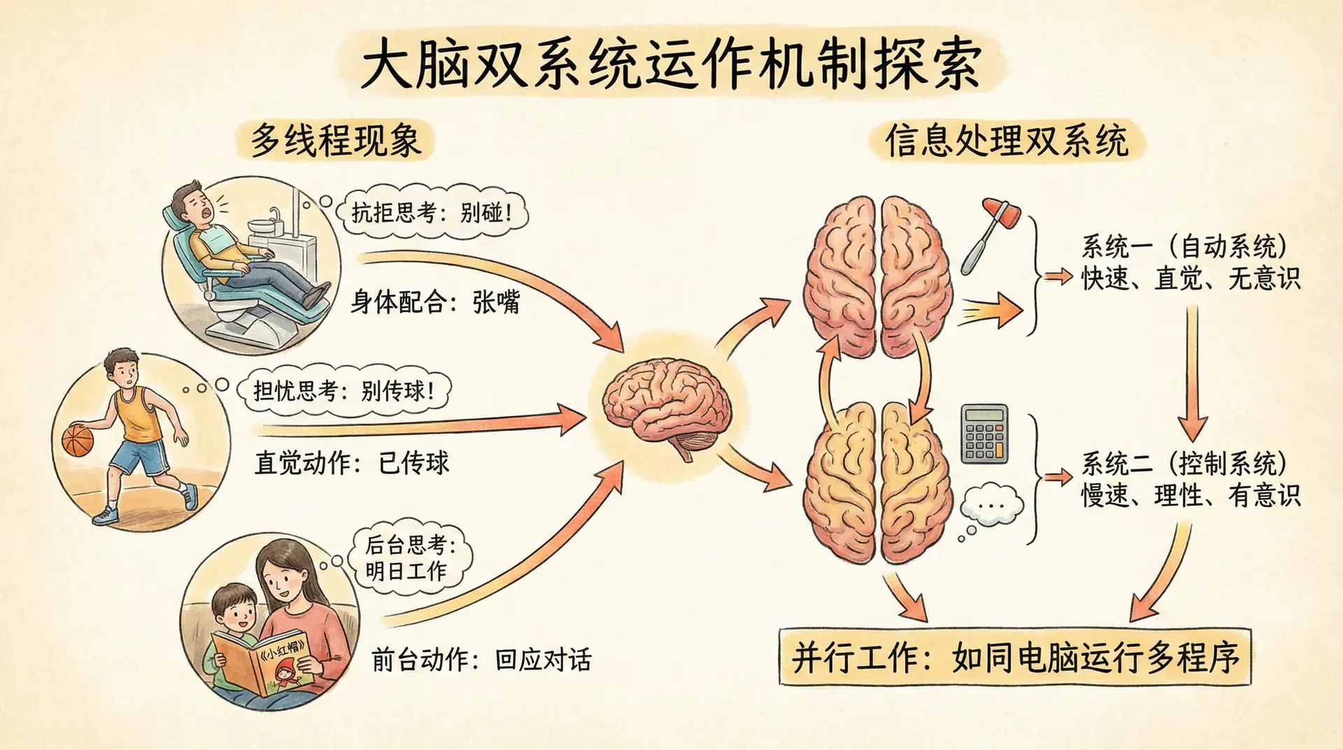 更奇妙的是,当你给孩子念故事书时,嘴巴在机械地读着《小红帽》,大脑却在盘算明天的工作安排。这时如果有人跟你说话,你竟然还能同时回应对话。这些现象说明,我们的大脑其实有两套处理信息的系统在同时工作,就像一台电脑同时运行着多个程序。