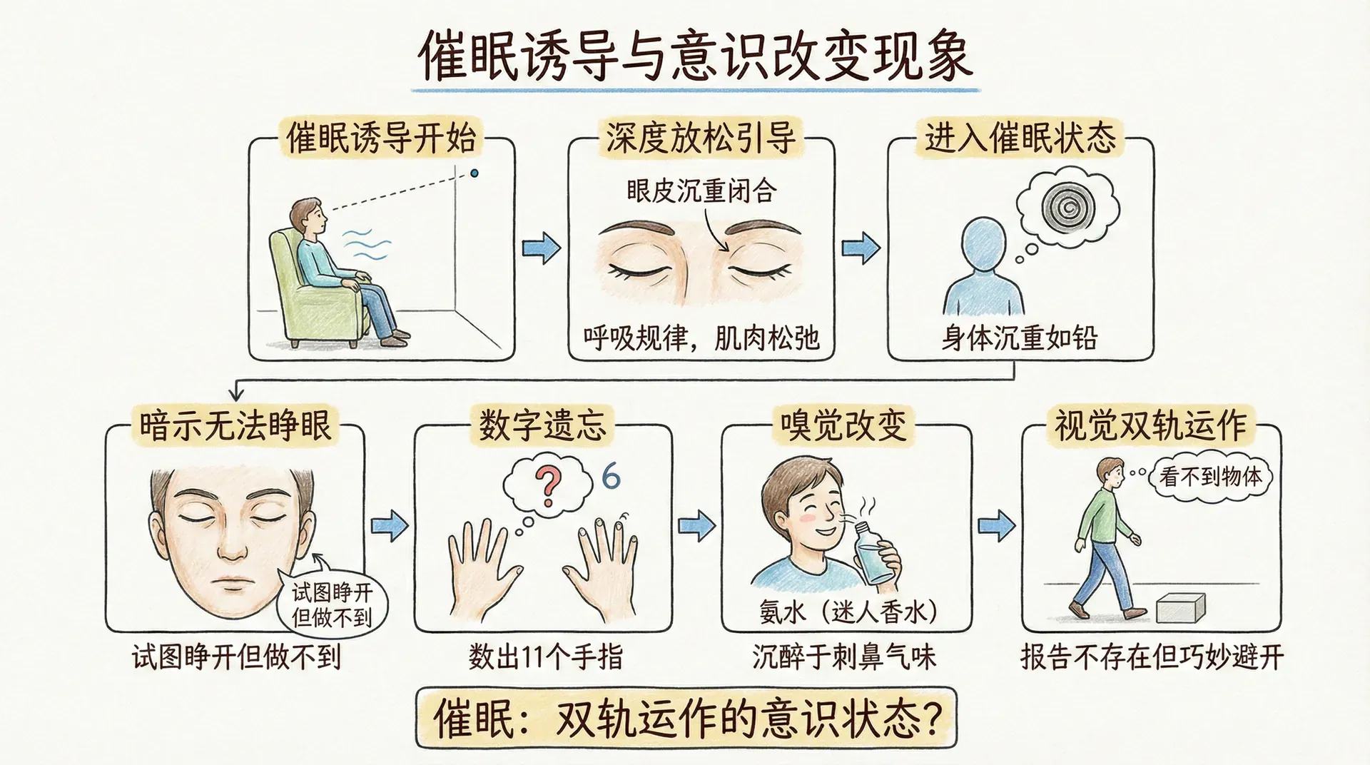 经过几分钟的催眠诱导,你可能会体验到催眠状态。当催眠师暗示“你的眼皮紧紧闭合,即使你试图睁开也做不到”时,你可能真的感觉无法控制自己睁开眼睛。如果被告知忘记数字6,你可能会困惑地数出手指有11个。