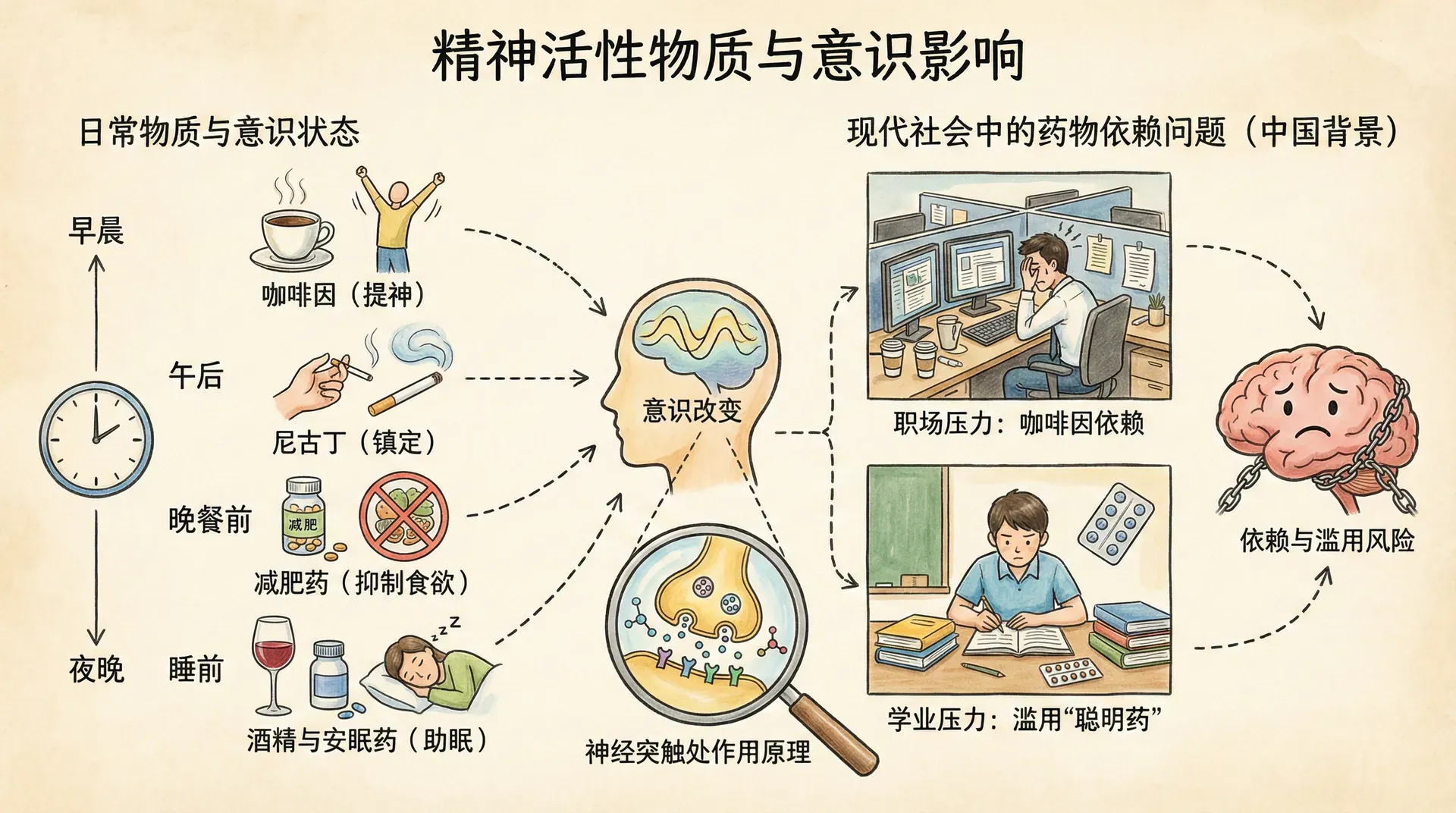 精神活性药物是通过在神经突触处的作用改变感知和情绪的化学物质。现代人的一天往往被各种影响意识的化学物质包围:早晨的咖啡提神,午后的香烟镇定神经,晚餐前的减肥药抑制食欲,睡前的红酒和安眠药助眠。从合法的处方药到日常的咖啡因,这些物质深刻影响着我们的意识状态。