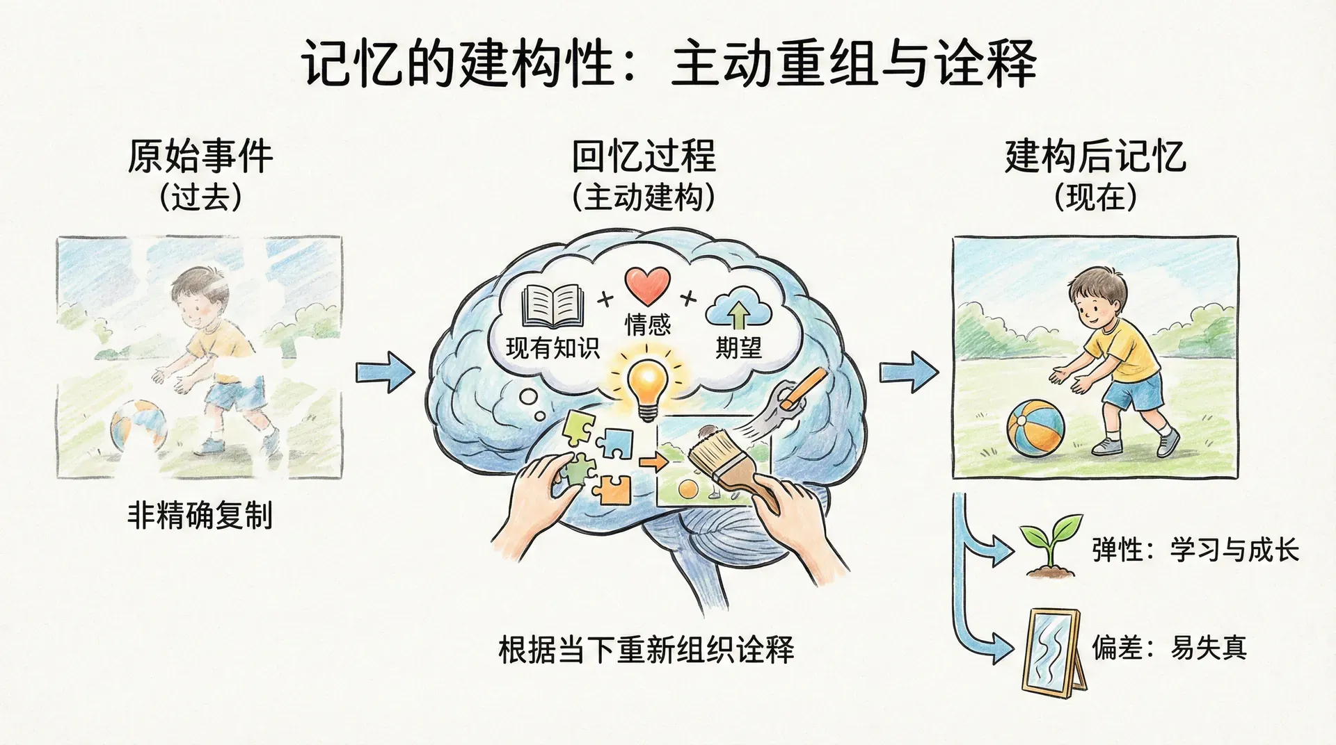 记忆并不是对过去的精确复制,而是一个主动的建构过程。每次我们回忆某个事件,大脑都会根据现有的知识、情感和期望对记忆进行重新组织和诠释。这一特性使记忆具有弹性,让我们能够从经验中学习和成长,但同时也使记忆容易产生偏差,甚至出现失真。