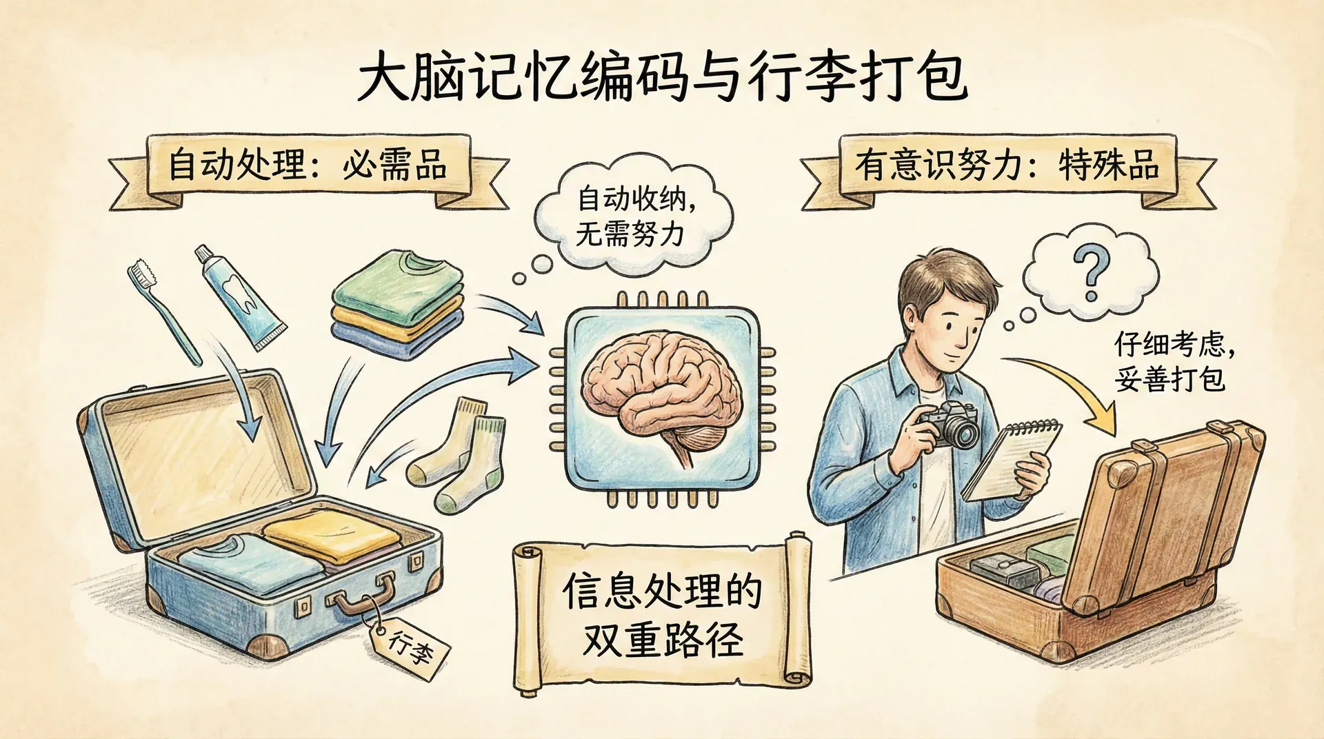 为一次长途旅行收拾行李时,有些东西你会自动放进去——牙刷、换洗衣物这些必需品;但有些东西需要仔细考虑。大脑在处理信息时也有类似的逻辑:有些信息会自动被记忆系统收纳,而有些则需要有意识的努力才能妥善“打包”。