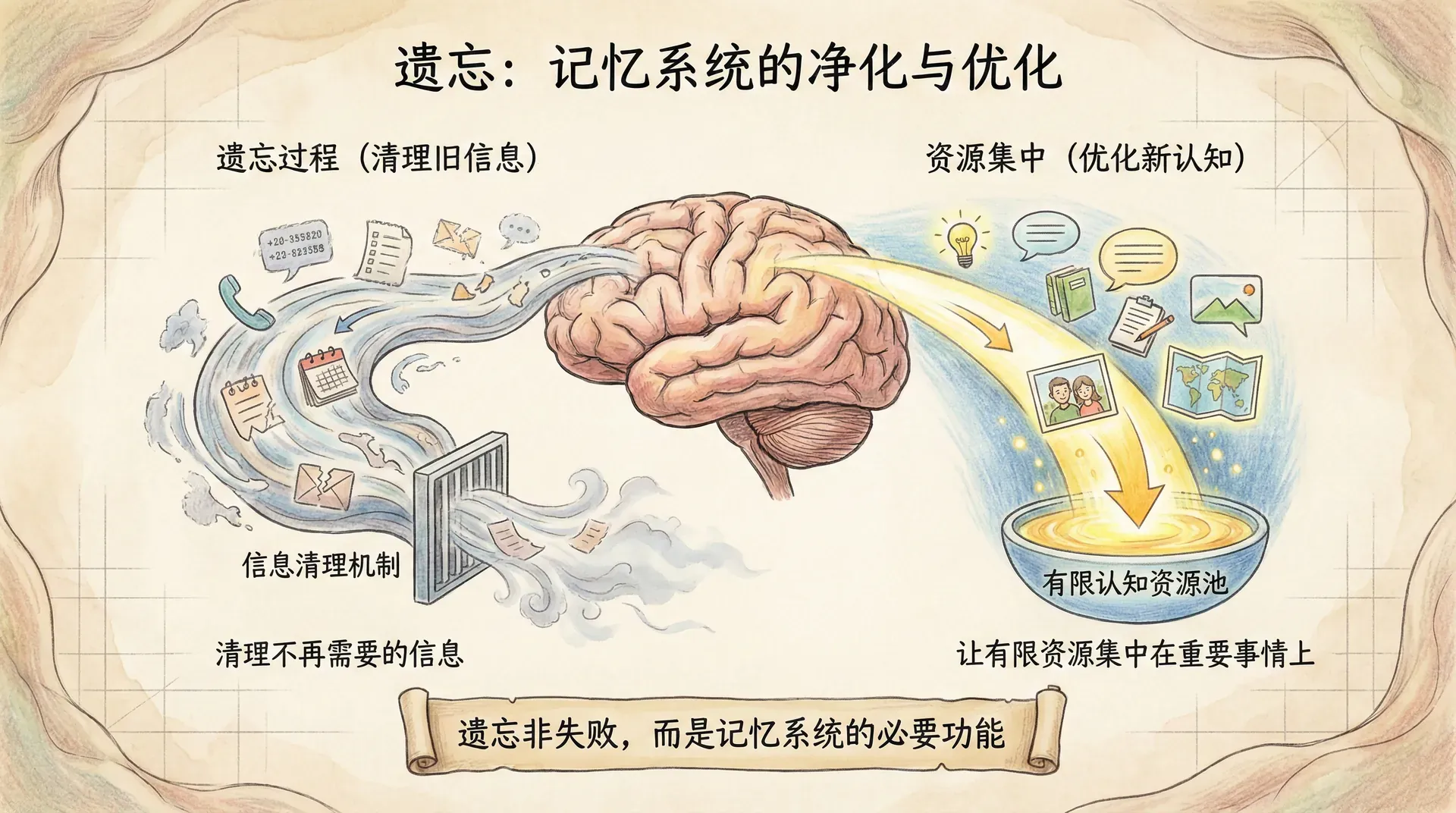遗忘不是记忆的失败,而是记忆系统的一个重要功能。它就像房间里的清洁工,帮助我们保持心理空间的整洁,让真正有价值的信息得以凸显。