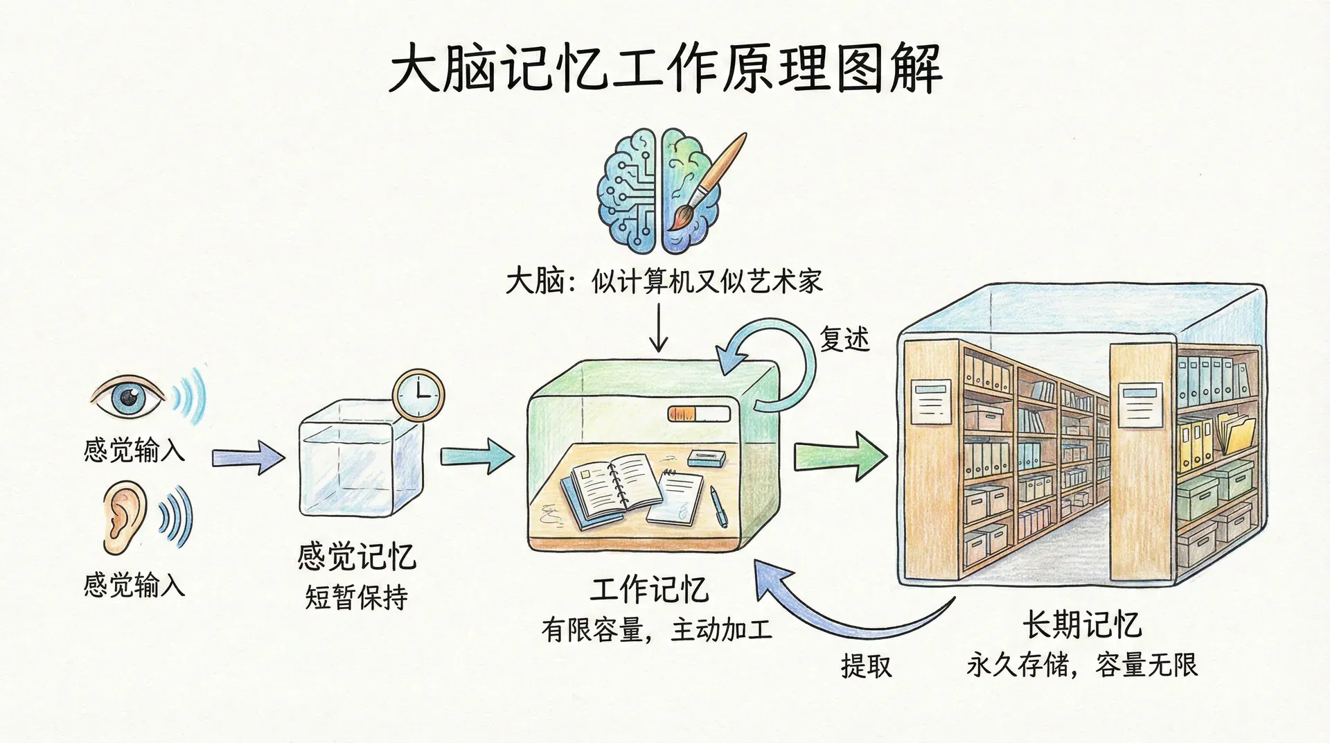 要理解记忆是如何工作的,可以把大脑看作一台极其复杂的超级计算机。与计算机不同的是,人脑的“存储”并不是简单的复制粘贴,而更像一位艺术家的创作过程,每次“保存”都可能带来微妙的变化。心理学家发现,记忆系统大致可以分为三个相互连接的工作站:感觉记忆、工作记忆和长期记忆,它们各有分工,协同完成信息从输入到存储再到提取的全过程。