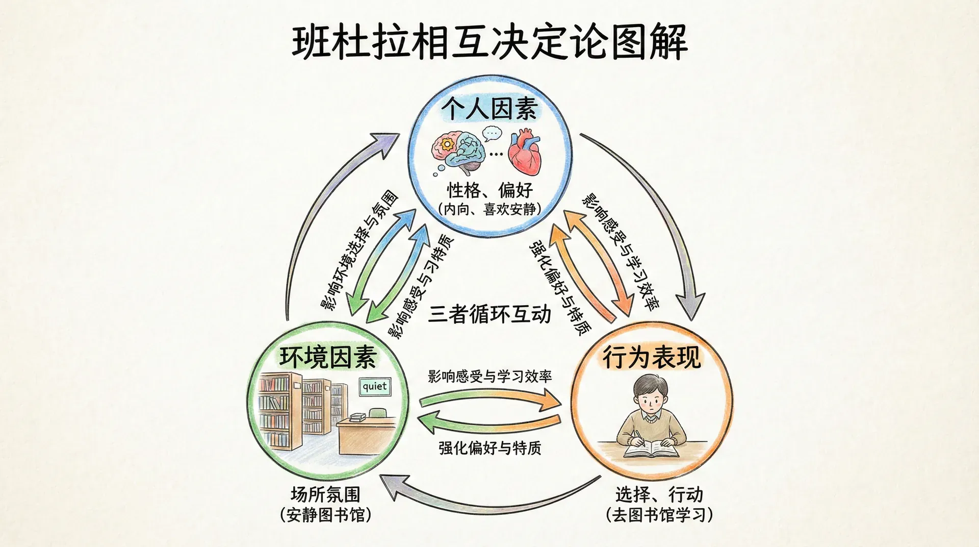 班杜拉提出的“相互决定论”可以用一个三角形来理解,三个角分别是个人因素、环境因素和行为表现,三者之间互相影响。一个内向的人选择去图书馆而不是酒吧。在安静的图书馆里,他感到很舒适,学习效率很高。这种积极的体验又强化了他对安静环境的偏好,同时他的存在也影响了图书馆的氛围。个人特质影响了环境选择,环境又反过来影响了个人的感受和行为,三者就这样循环互动。