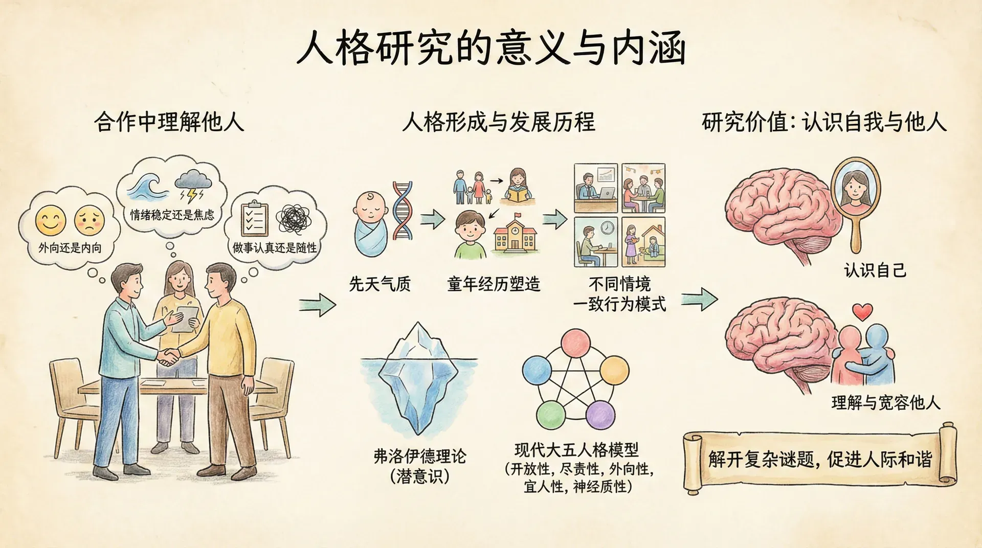 如果你要和陌生人合作,你最想了解什么?不是身高体重,而是性格——外向还是内向,容易焦虑还是情绪稳定,做事认真还是随性。这些都是人格特质的体现。人格心理学研究范围广泛,从与生俱来的气质,到童年经历如何塑造性格,再到我们在不同情境中的一致行为模式。从弗洛伊德到现代大五人格模型,心理学家们一直在解开人格这个复杂的谜题。理解人格,不仅帮助我们认识自己,也让我们在与他人的相处中多一份理解和宽容。