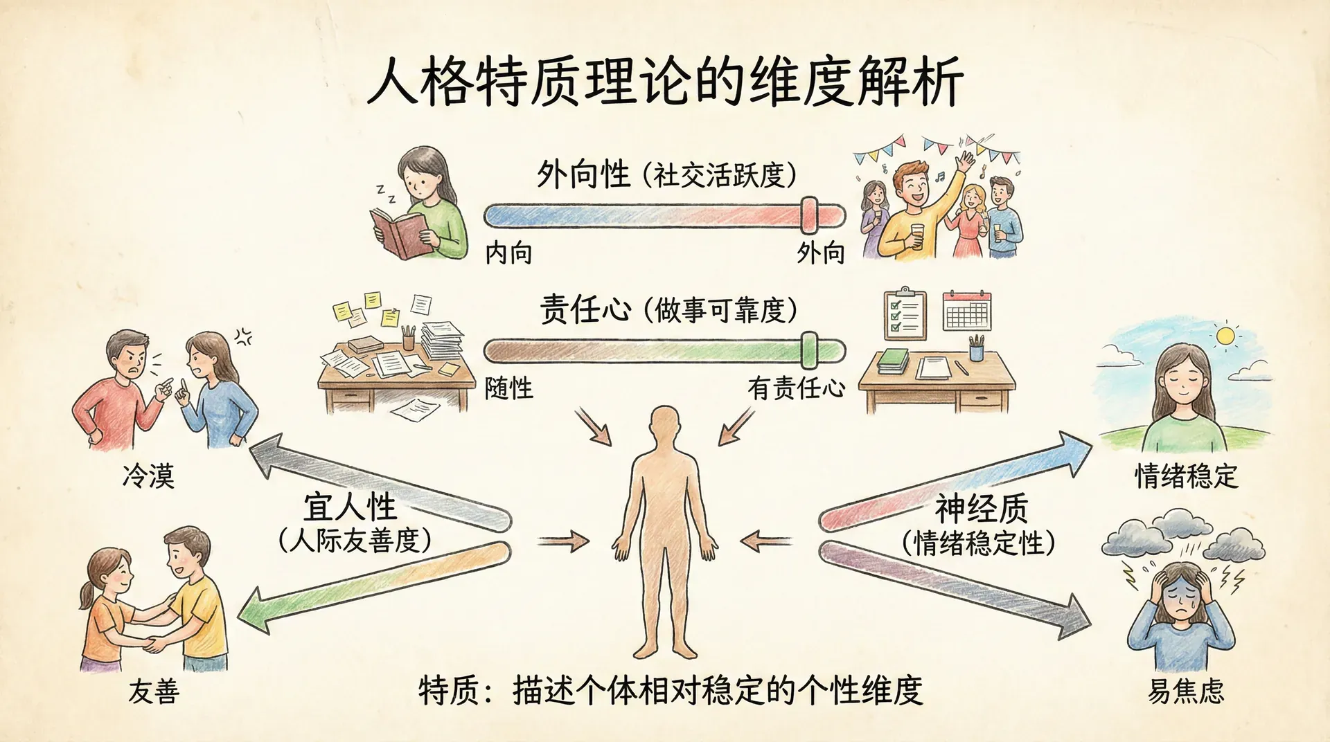 如果要向一个从未见过某人的朋友描述那个人,你会怎么说?大概会说“他很外向,总是能活跃气氛”,或者“她很有责任心,答应的事情一定会做到”。这些描述,都是在说一个人的特质。特质理论认为,我们可以用一组相对稳定的维度来描述每个人的个性,而这些维度正是人格心理学最重要的研究对象之一。