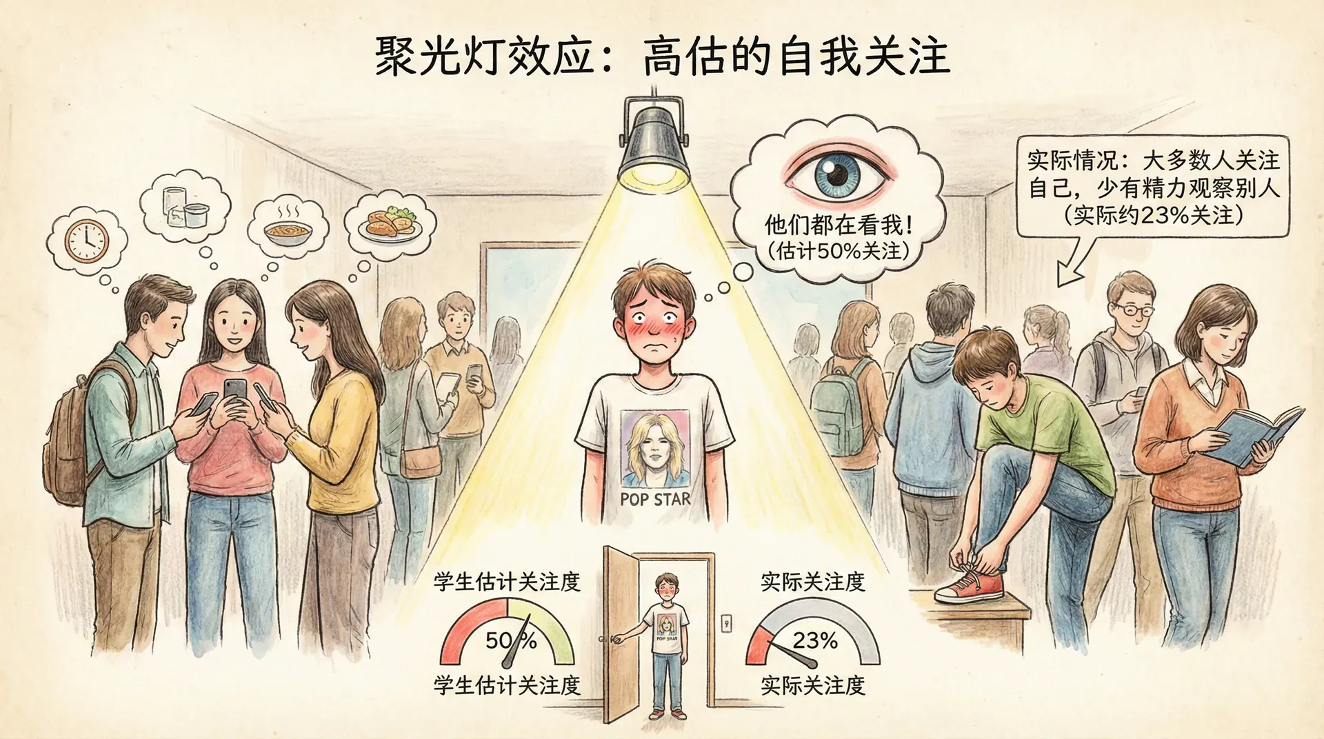 这就是“聚光灯效应”——我们总是高估别人对我们的关注程度。实际上,大多数人都忙着关注自己,很少有精力去仔细观察别人。