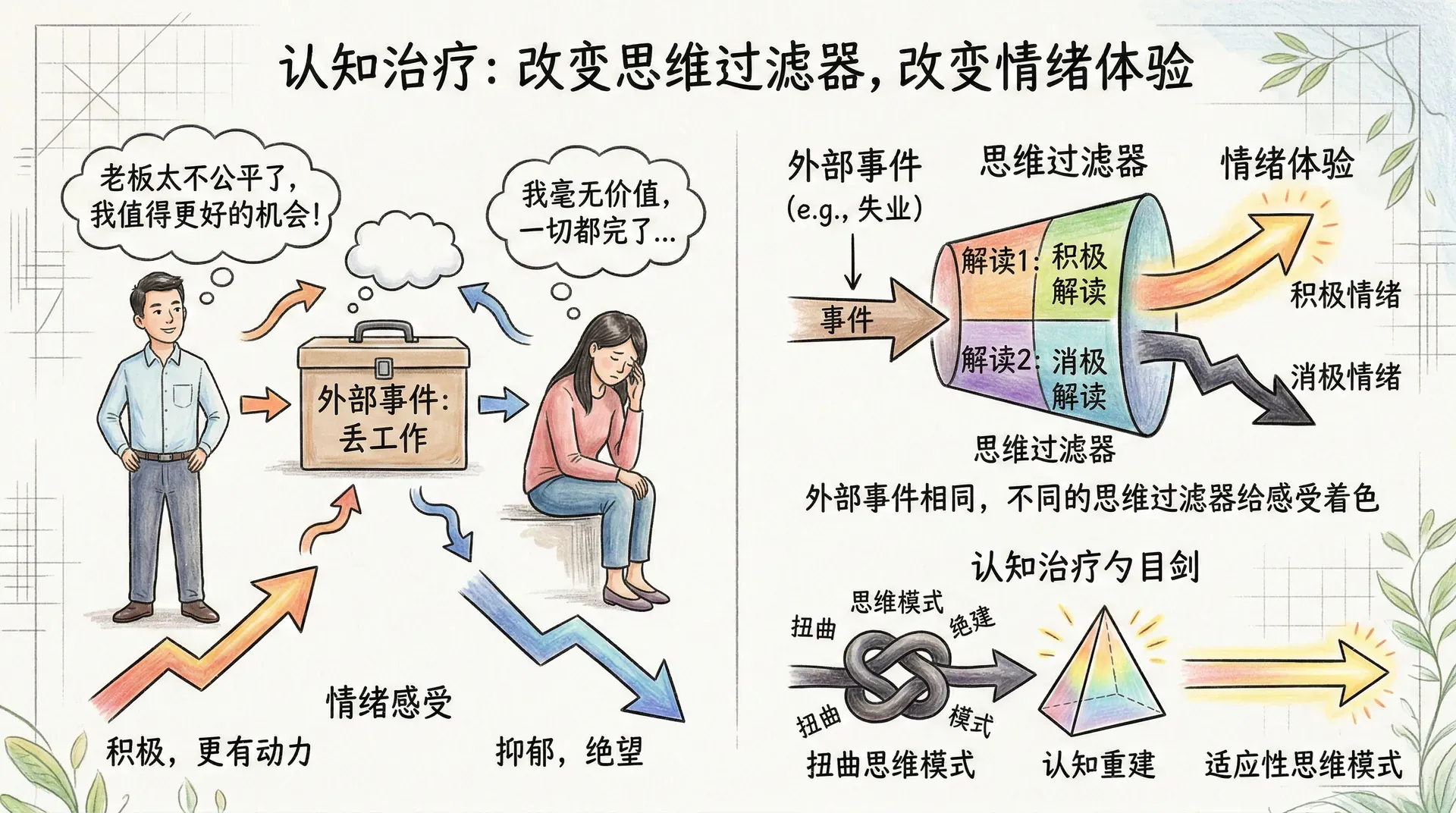 行为治疗在处理具体的恐惧症和问题行为时表现出色,但面对重度抑郁症或广泛性焦虑症时,单纯改变外在行为往往并不足够。认知治疗的出现填补了这一空缺。认知治疗的核心主张是:我们的思维给感受着色。同样一件事,不同的解读方式会带来截然不同的情绪体验。两个人同时丢了工作,一个人的想法是“我的老板太不公平了,我值得更好的机会”,另一个人则认为“我毫无价值,一切都完了”。外部事件相同,但内在的解读决定了情绪走向。认知治疗的目标,就是帮助来访者识别并改变那些扭曲的思维模式。