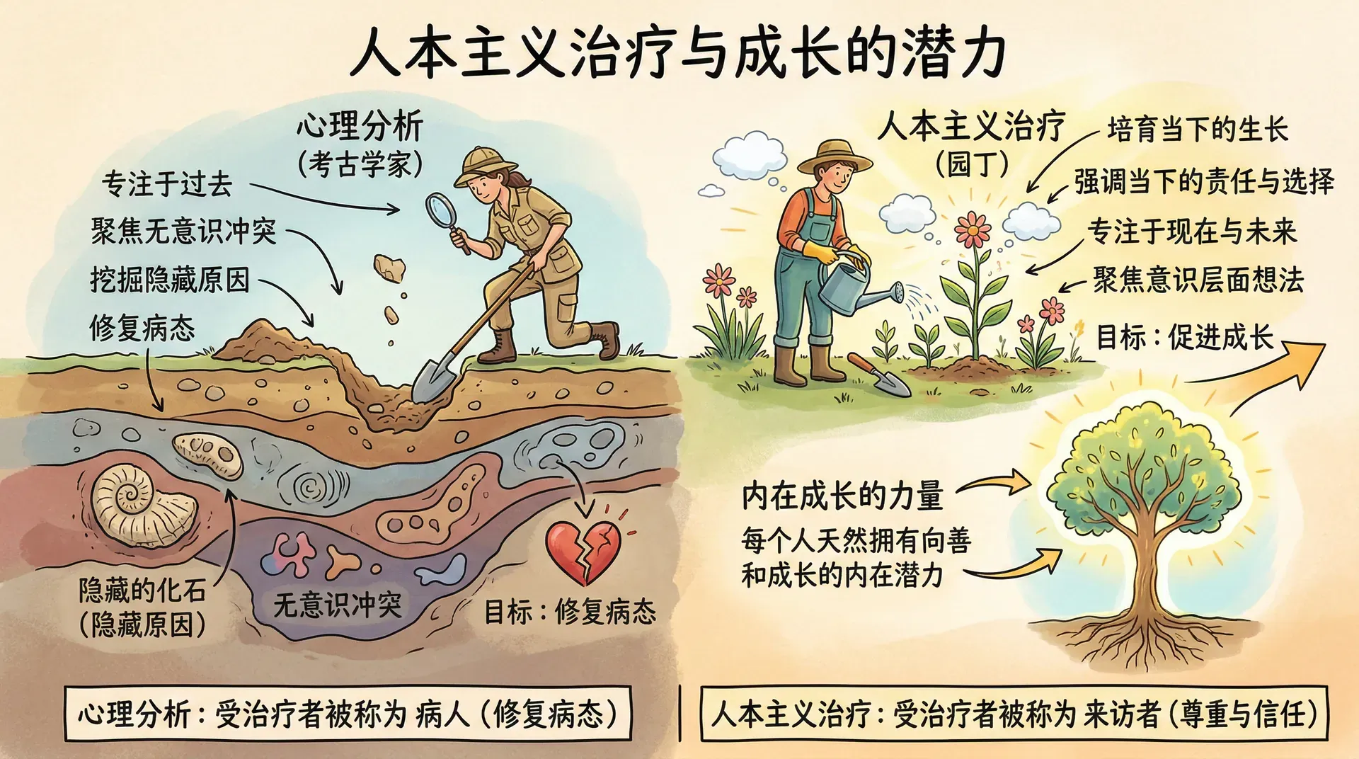 如果说心理分析像考古学家一样执着于挖掘过去,那么人本主义治疗则更像园丁,专注于培育当下的生长。人本主义心理学家相信,每个人都天然拥有向善和成长的内在潜力,心理问题的出现往往是因为这种潜力受到了压抑或阻碍。