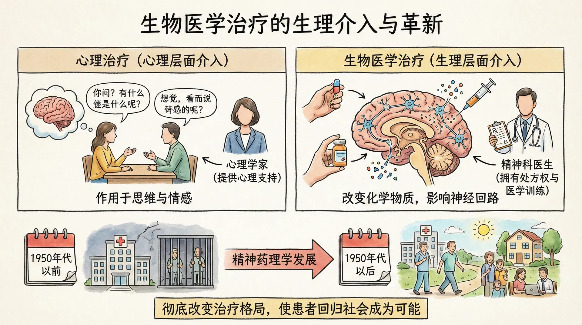 生物医学治疗的存在提醒我们一个根本性的事实:一切心理的,也都是生物的。每一个想法、每一种情绪、每一段抑郁,都对应着大脑中某种电化学活动的变化。而这种关系是双向的:心理治疗能够带来可测量的大脑变化,大脑的改变同样反过来影响心理状态。