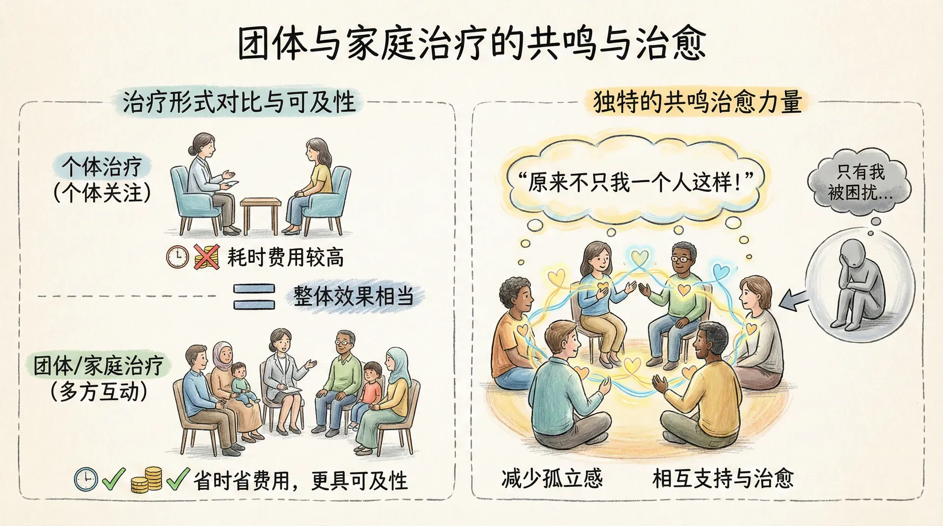 团体治疗师经常向那些经历家庭冲突或其行为令他人困扰的来访者推荐团体治疗。在团体中,成员不仅能够发现自己并不孤单,还能够从他人的经历和反馈中获得新的视角,这是个体治疗难以提供的体验。