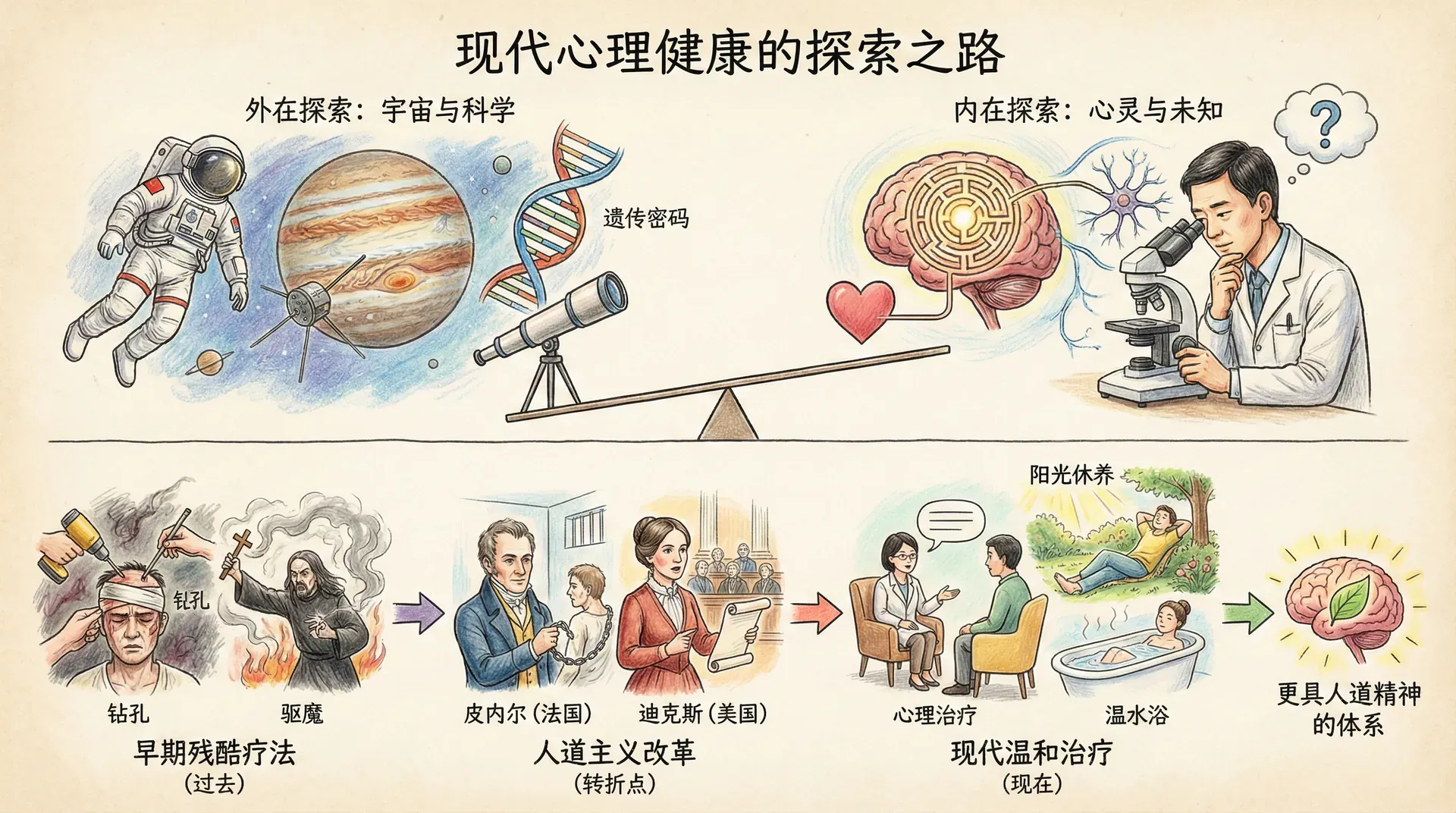 从古至今,人们从未停止寻找治疗心理困扰的方法。历史上有些做法今天看来令人咋舌:在头上钻孔、放血、驱魔。也有一些相对温和的方式:温水浴、按摩、在阳光充足的地方休养。这种从残酷到温和的转变,要归功于法国的菲利普·皮内尔和美国的多萝西娅·迪克斯等改革者,他们推动建立了更具人道精神的心理治疗体系。
