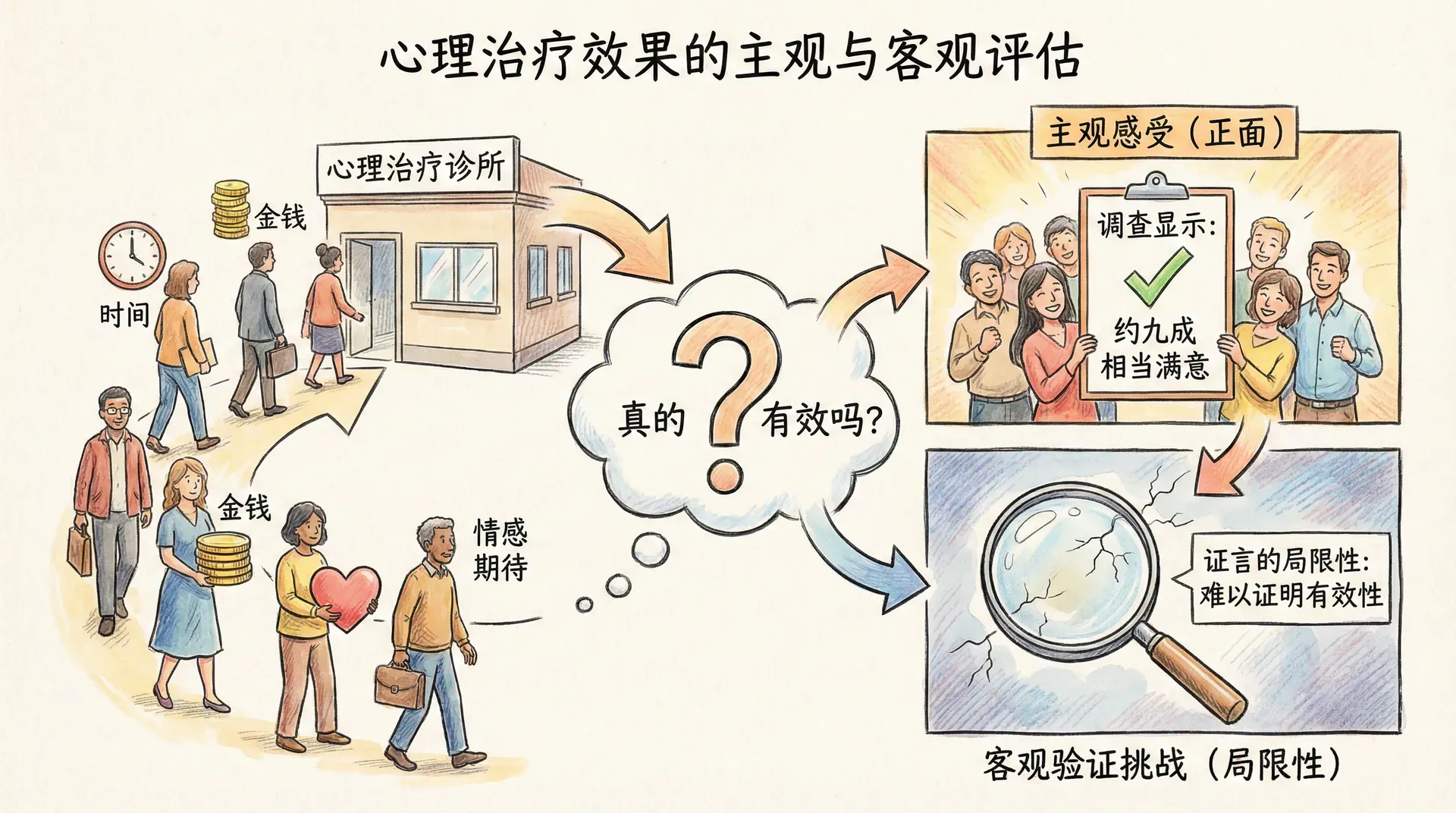 数以百万计的人每年寻求心理治疗,投入大量的时间、金钱与情感期待。一个自然的问题随之而来:心理治疗真的有效吗?这个问题的答案并不像直觉上以为的那样简单明了。来访者的主观感受通常是正面的。一项针对近三千名来访者的调查显示,大约九成的受访者表示对心理治疗“相当满意”。但这些来自亲身经历者的证言,能否真正证明治疗的有效性,却有几个难以回避的问题。
