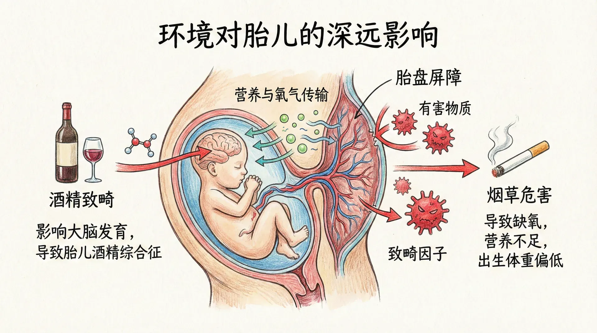 酒精是最具代表性的致畸因子之一。孕妇饮酒后,酒精会直接进入胎儿的血液系统,影响胎儿的大脑发育。情况严重时,会导致胎儿酒精综合征,孩子出生后可能出现面部发育异常和智力障碍。烟草同样危险,孕妇吸烟会导致胎儿缺氧、营养不足、出生体重偏低,并增加多种健康问题的风险。