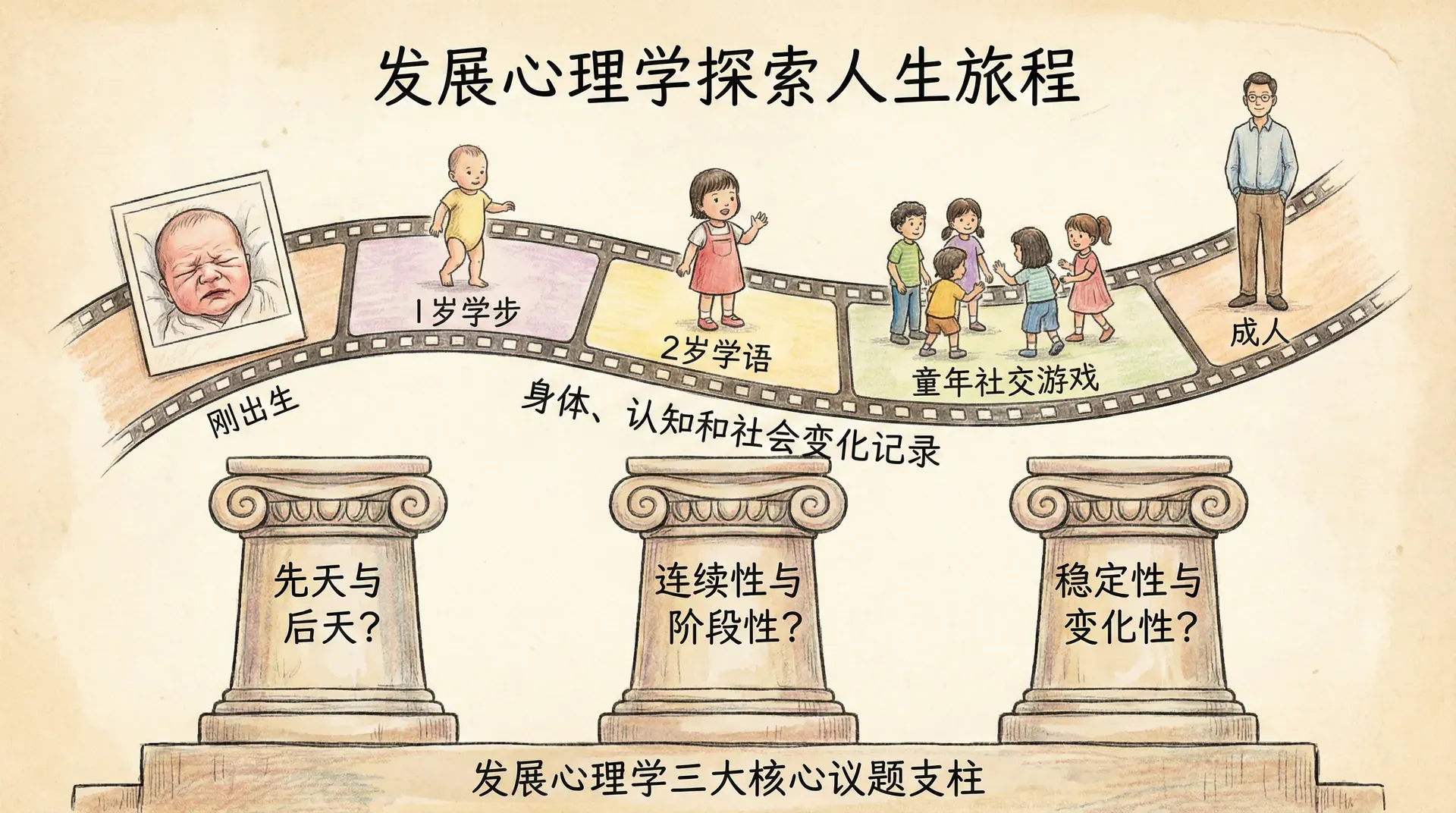 发展心理学记录着人从出生到死亡这一路走来的身体、认知和社会变化。这门学科围绕三个根本性的问题展开探索,它们就像三根支柱,共同支撑着整个发展心理学的大厦。