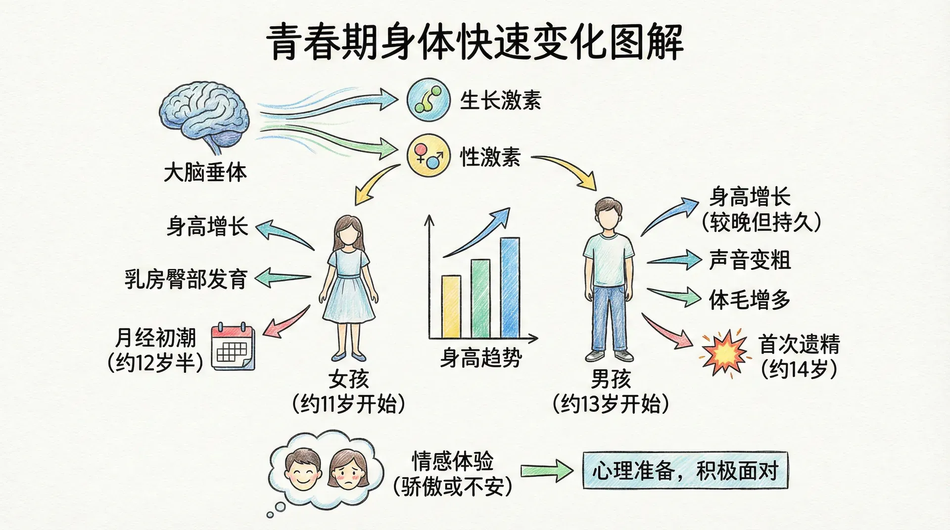 青春期最显著的外部标志是身体的快速变化。这一切始于大脑深处的垂体,它开始大量分泌生长激素和性激素,引发一系列生理变化。