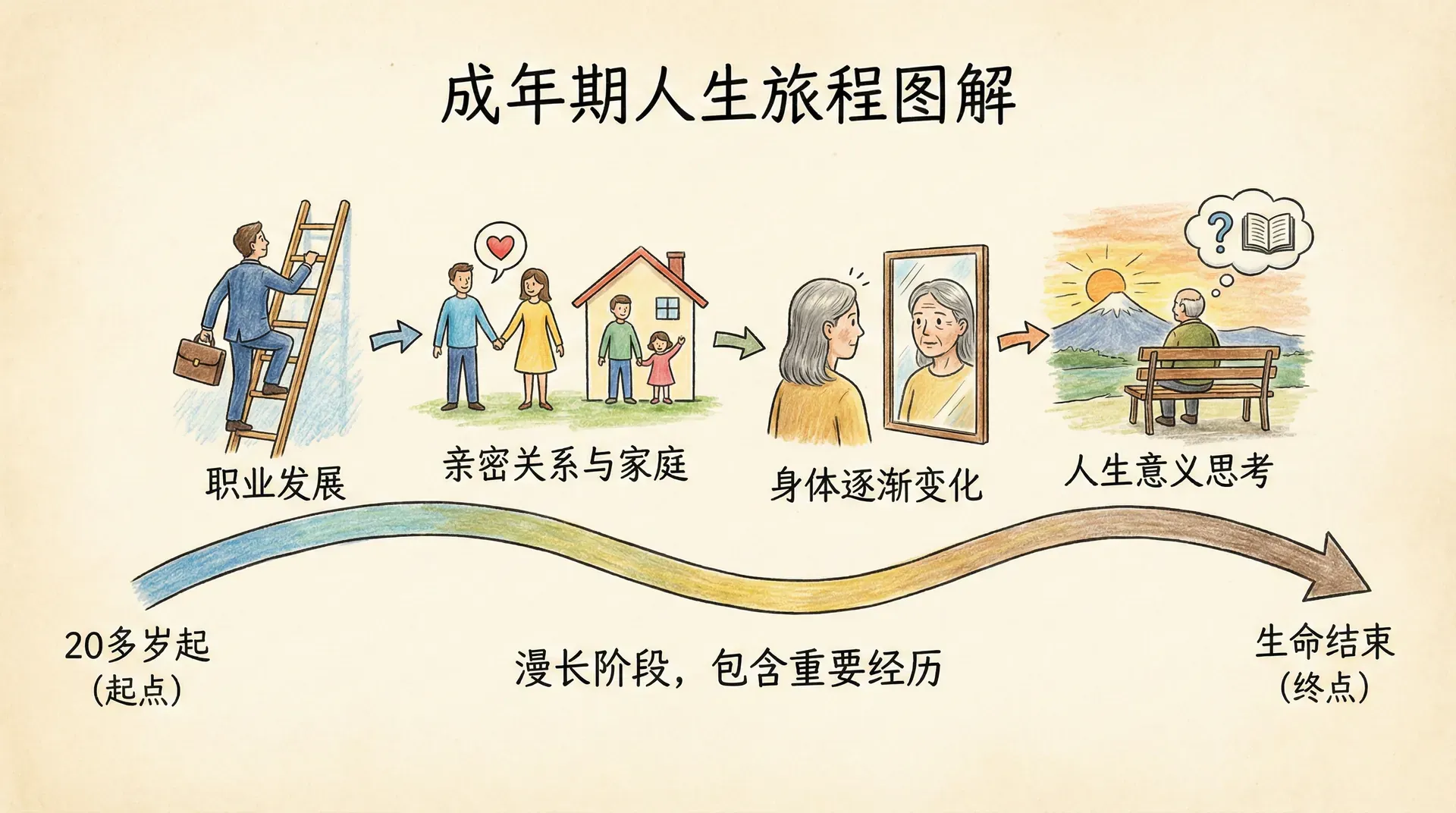 成年期是人生中历时最长的阶段,从20多岁延续到生命结束。这个漫长的时期包含了大多数人最重要的人生经历:职业的发展、亲密关系的建立、家庭的形成、身体的逐渐变化,以及对人生意义的深入思考。
