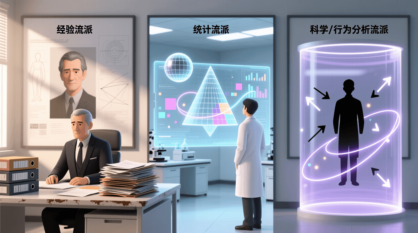 罪犯画像通常分为三个主要流派,核心区别在于画像人员依据什么样的知识基础来推断犯罪分子的特征。