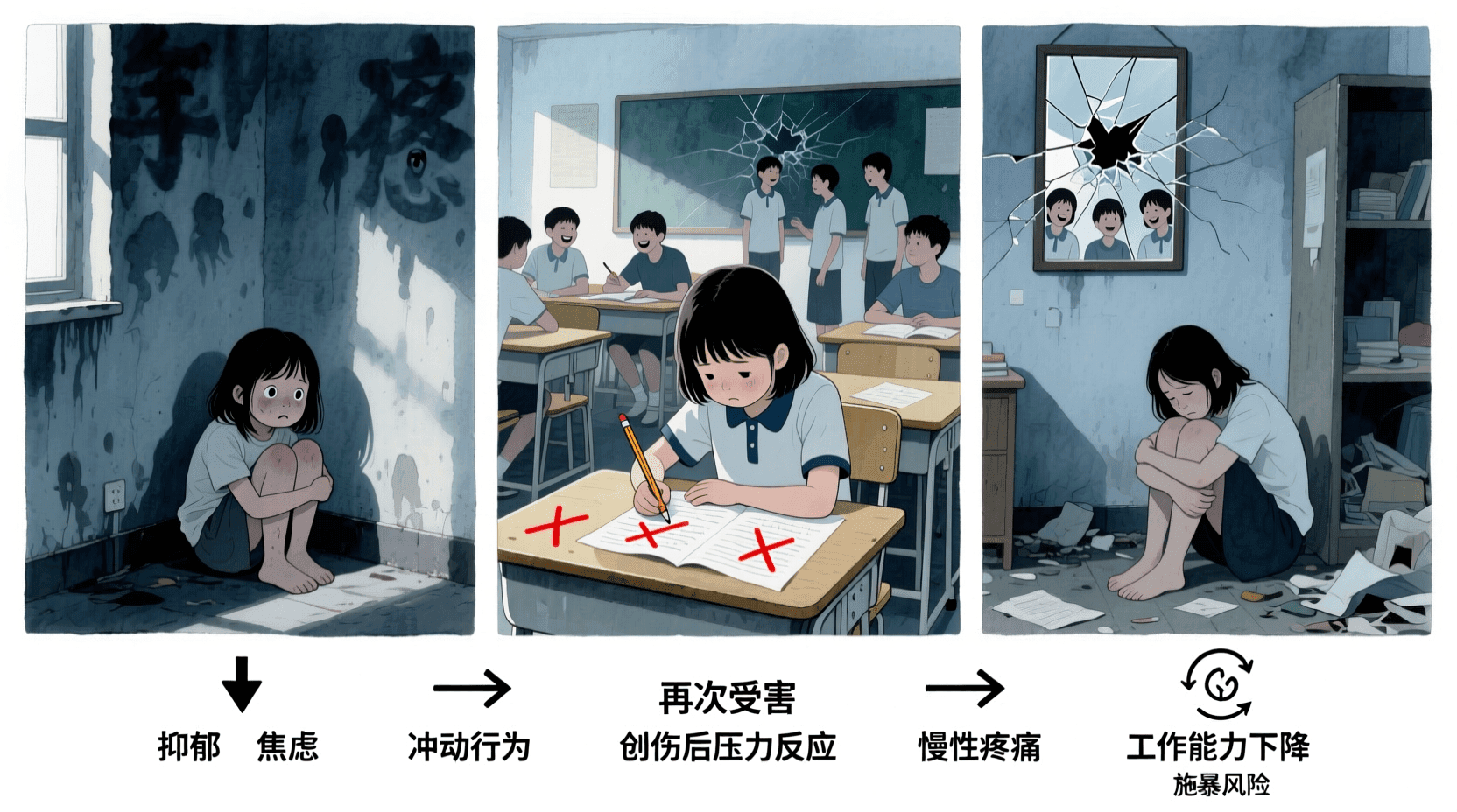 童年期的虐待和忽视可能引发心理健康问题、学业困难和行为障碍,同时增加再次受害和成为施暴者的风险。成年期的受害经历则与身心健康恶化密切相关,严重损害受害者的生活质量和社会功能。