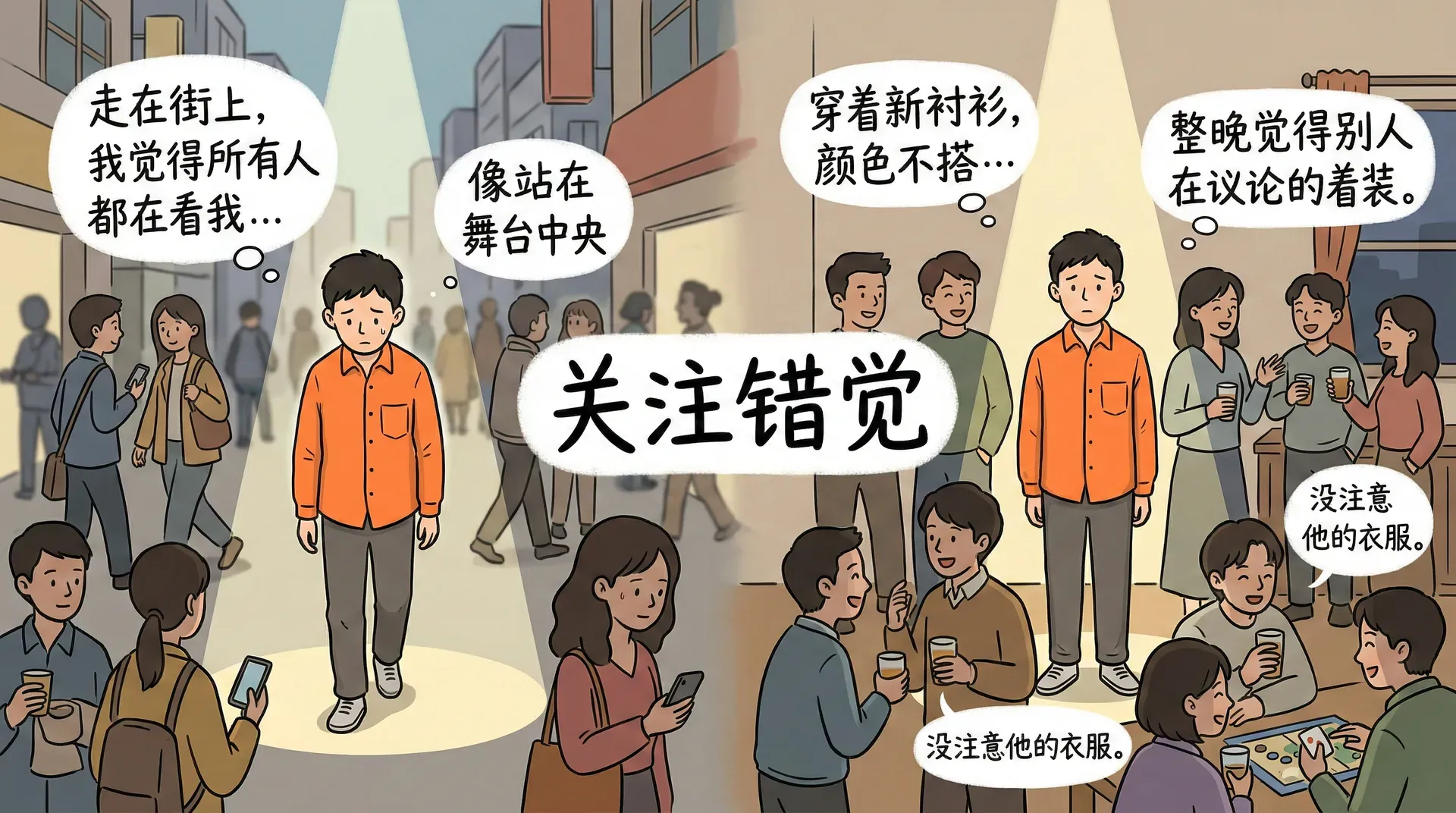 当我们走在街上,往往会觉得周围所有人的目光都聚焦在自己身上,就像站在舞台中央被聚光灯照射一样。心理学家把这种现象称为“聚光灯效应”,它让我们系统性地高估了他人对我们外表和行为的关注程度。穿着一件新买的衬衫去参加朋友聚会,发现颜色和场合不太搭配,你可能会整晚觉得别人在议论你的着装,但实际上大多数人根本没有注意到,或者即使注意到了也不会特别在意。