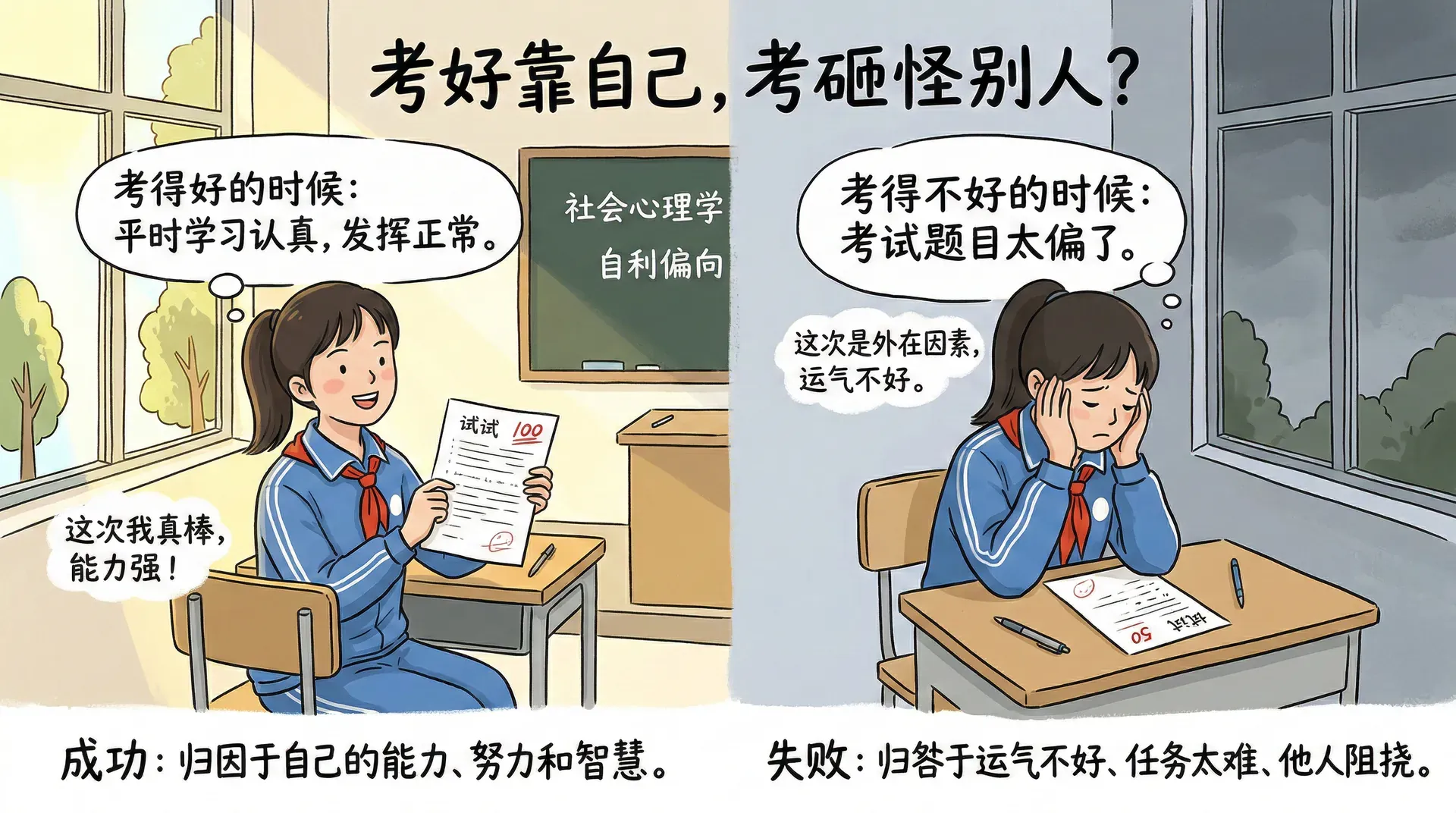 这种现象在中国的学生群体中表现得很明显:考得好的时候,学生会说“我平时学习认真,考试发挥正常”;考得不好的时候,则可能抱怨“这次考试题目太偏了”或者“我那天身体不舒服”。中国有句古话:“胜败乃兵家常事。”这提醒我们要以平常心看待成败,但现实中,大多数人很难做到真正的心平气和,总是倾向于美化自己的成功,淡化自己的失败。